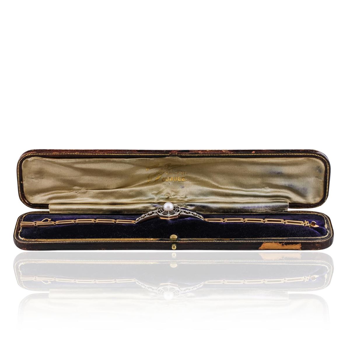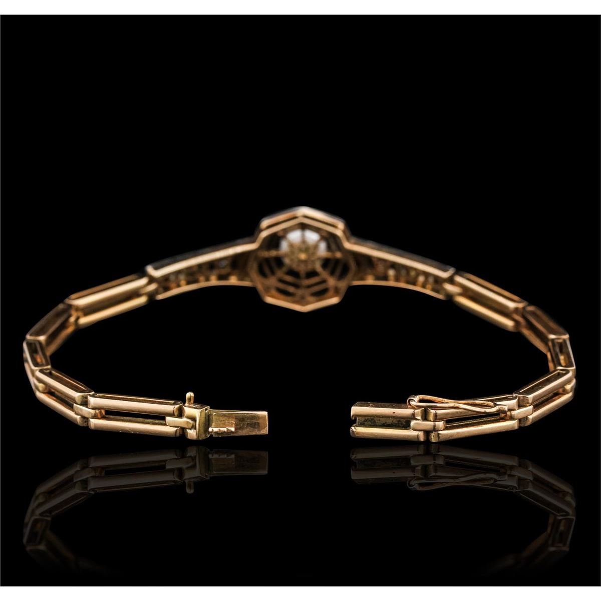 One electronically tested 14KT rose and white gold ladies hand assembled antique bracelet with a hidden box clasp with safety closer with a antiqued finish. Measurements: 7.50" in length. Condition is very good. Containing: One akoya cultured pearl, 6.5mm in size to 6.5mm in size. The pearl is white in color with a good luster, acceptable nacre, near round to off round, moderately blemished. Six gypsy set transitional cut diamonds, measuring 2.00 - 1.50 x 0.93mm (depth est.) approximate total weight of 6 Stones = 0.10ct. Clarity: SI-2 to I-1. Color: I - J, Cut is Good. Twenty-Six bead set rose cut diamonds, measuring 1.30 - 1.30 x 0.81mm (depth est.) approximate total weight of 26 Stones = 0.15ct. Clarity: I-1 to I-2. Color: I - J. Colored gemstones are presumed to have been subjected to commonly used enhancement processes. All diamonds and colored gemstones are graded in the mounting, unless otherwise stated. Total Weight of Diamonds 0.26ct. Total Weight of Bracelet 18.20 grams. GGL Appraised at $6,885.00.