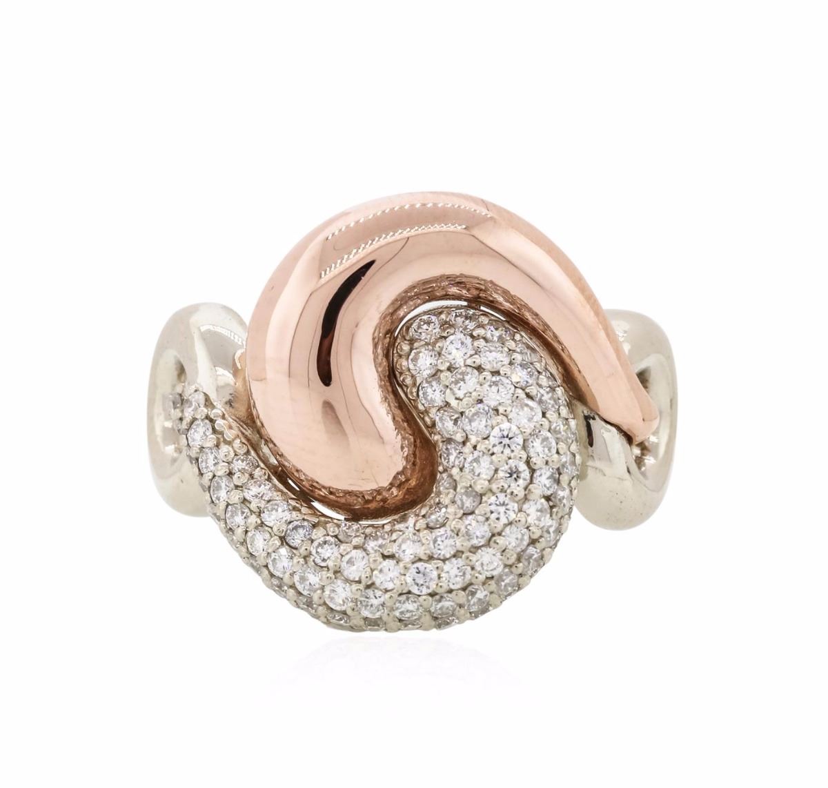 One electronically tested 14KT rose and white gold ladies combination cast & assembled diamond ring with a flat shank with rounded edges with a bright polish finish. Identified with markings of "K14". Condition is new. Containing: Eighty-Two prong set round brilliant cut diamonds, measuring 1.10 - 1.10 x 0.66mm (depth est.) approximate total weight of 82 Stones = 0.39ct. Clarity: I-1. Color: H - I, Cut is Good. All diamonds are graded in the mounting, unless otherwise stated. Total Weight of Diamonds 0.39ct. Total Weight of Ring 6.50 grams. GGL Appraised at $3,565.00.