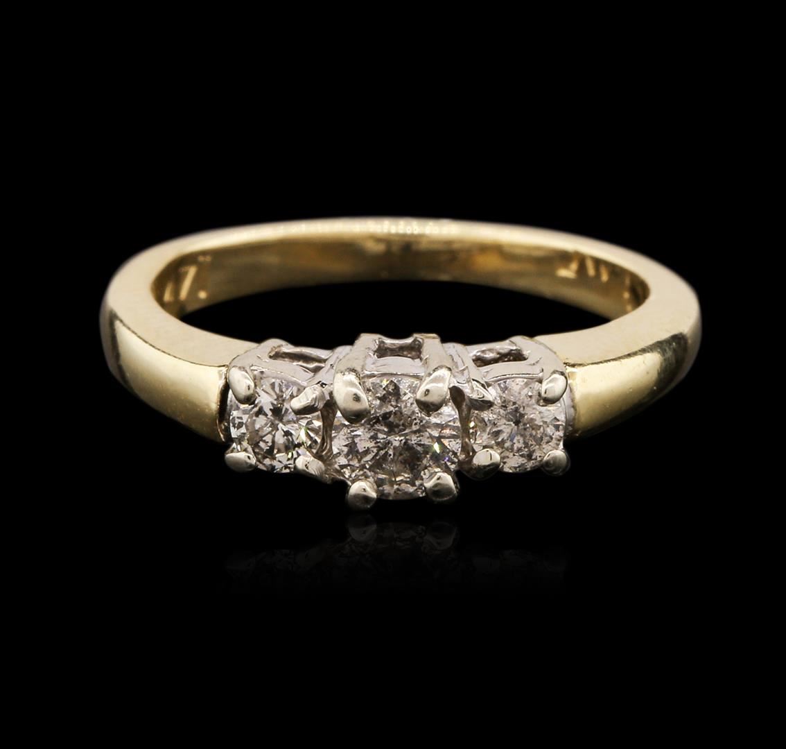 One electronically tested 14KT yellow and white gold ladies cast three diamond ring with a bright polish finish. The ring is completed by a two millimeter wide band. Identified with markings of "14K". Condition is good. Containing: One prong set round brilliant cut diamond, measuring 3.90 - 3.90 x 2.48mm (depth est.) approximate weight of 0.24ct. Graded in the setting. Clarity: I-2. Color: J Two prong set round brilliant cut diamonds, measuring 3.10 - 3.00 x 1.50mm (depth est.) approximate total weight of 2 Stones = 0.18ct. Graded in the setting. Clarity: I-1 to I-2. Color: J - K. Total Weight of Diamonds 0.42ct. Total Weight of Ring 3.54 grams. AIG Appraised at $1,465.00.
