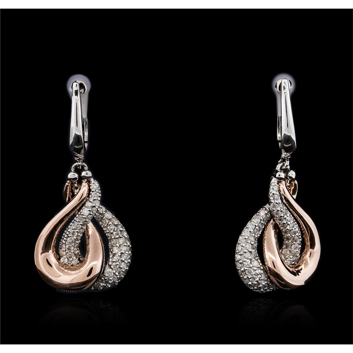 One pair electronically tested 14KT rose and white gold ladies cast diamond earrings with hinged clip backs with a bright polish finish. Identified with markings of "K14". Condition is new. Containing: One Hundred Ten bead set round brilliant cut diamonds, measuring 1.10 - 1.10 x 0.66mm (depth est.) approximate total weight of 110 Stones = 0.53ct. Clarity: I-1 to I-2. Color: I - J, Cut is Good. All diamonds are graded in the mounting, unless otherwise stated. Total Weight of Diamonds 0.53ct. Total Weight of Earrings 8.00 grams. GGL Appraised at $3,685.00.