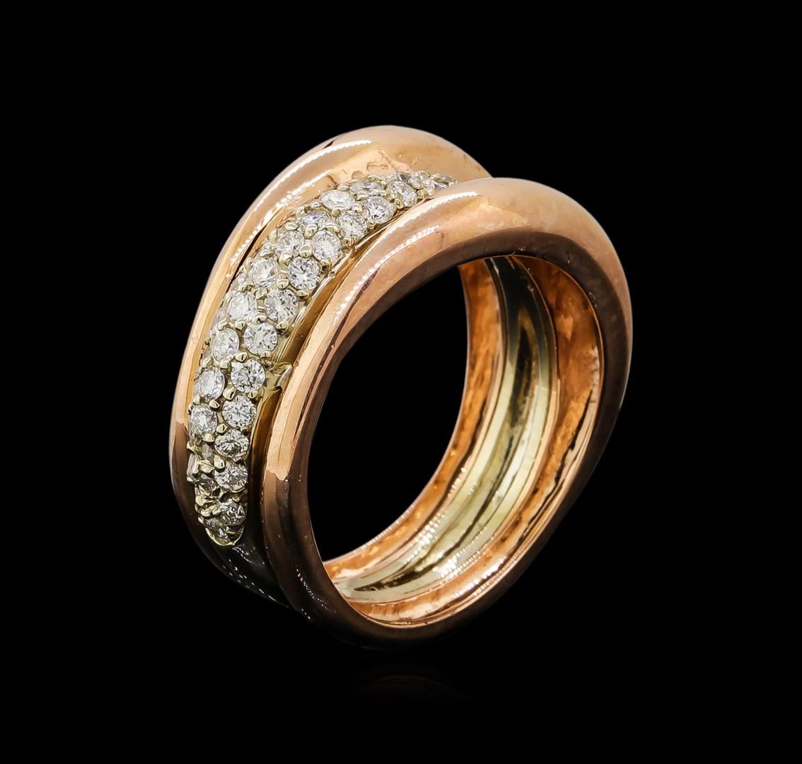 One electronically tested 14KT rose and white gold ladies combination cast & assembled diamond ring with a bright polish finish. Identified with markings of "14K". Condition is new. Containing: Forty-Five prong set round brilliant cut diamonds, measuring 1.50 - 1.50 x 0.90mm (depth est.) approximate total weight of 45 Stones = 0.55ct. Clarity: SI-2 to I-1. Color: I - J, Cut is Good. All diamonds are graded in the mounting, unless otherwise stated. Total Weight of Diamonds 0.55ct. Total Weight of Ring 7.10 grams. GGL Appraised at $3,435.00.