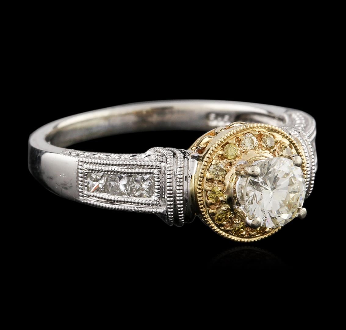 One ring featuring: 14KT white and yellow gold weighing 3.90 grams containing one prong set round center diamond with a total weight of 0.46ct and pave set round fancy yellow diamonds and channel set princess cut diamonds with a total weight of 0.26ct.