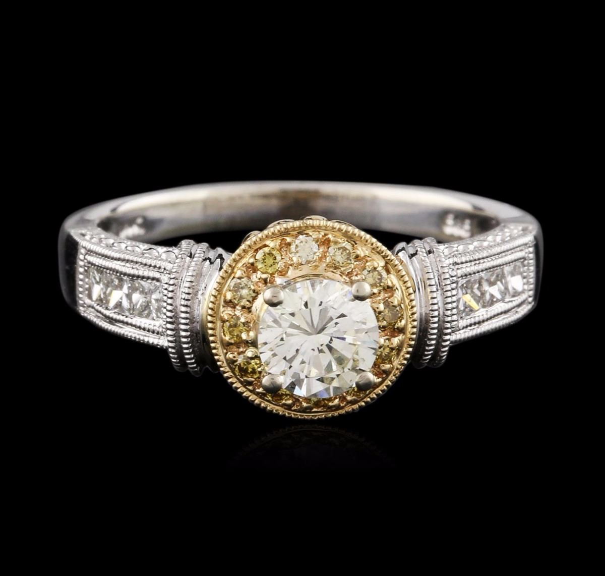 One ring featuring: 14KT white and yellow gold weighing 3.90 grams containing one prong set round center diamond with a total weight of 0.46ct and pave set round fancy yellow diamonds and channel set princess cut diamonds with a total weight of 0.26ct.