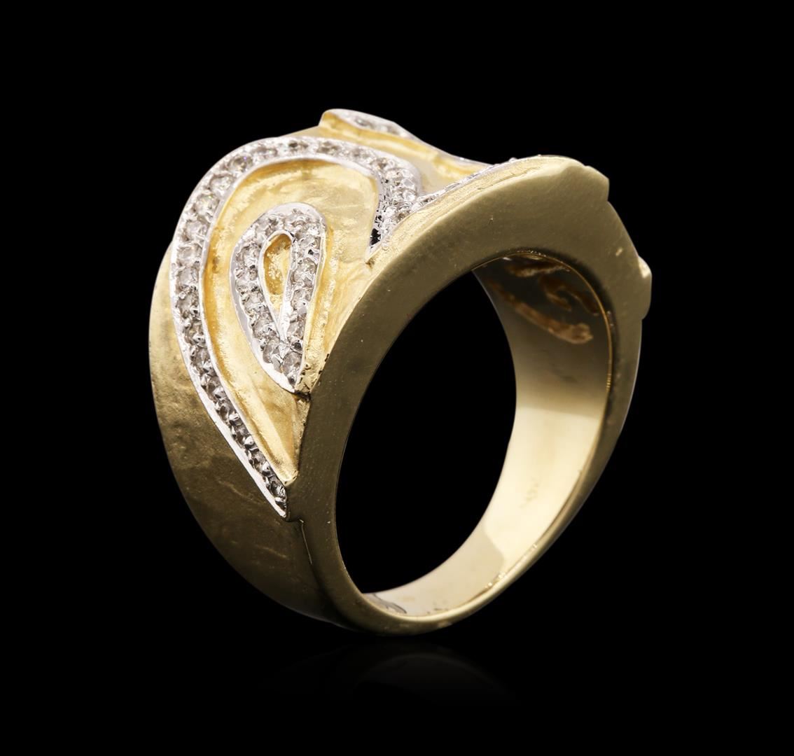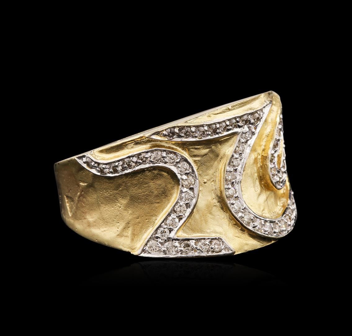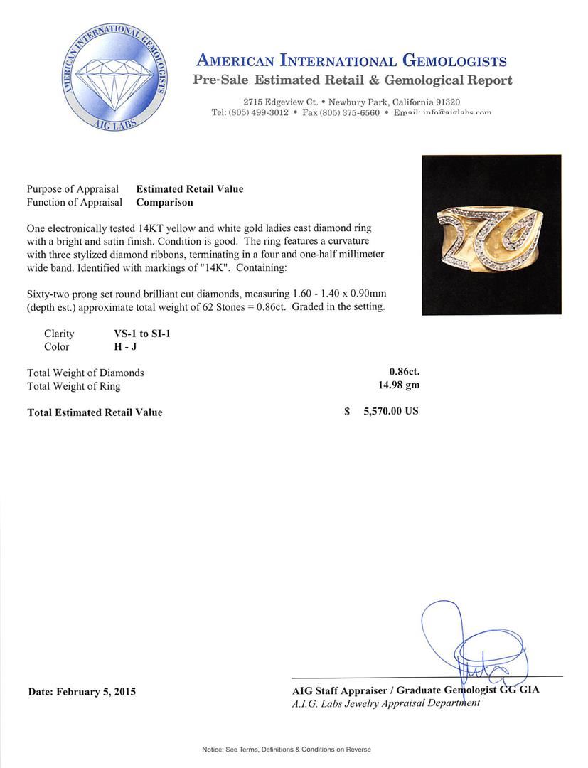 One electronically tested 14KT yellow and white gold ladies cast diamond ring with a bright and satin finish. The ring features a curvature with three stylized diamond ribbons, terminating in a four and one-half millimeter wide band. Identified with markings of "14K". Condition is good. Containing: Sixty-Two prong set round brilliant cut diamonds, measuring 1.60 - 1.40 x 0.90mm (depth est.) approximate total weight of 62 Stones = 0.86ct. Graded in the setting. Clarity: VS-1 to SI-1. Color: H - J. Total Weight of Diamonds 0.86ct. Total Weight of Ring 14.98 grams. AIG Appraised at $5,570.00.
