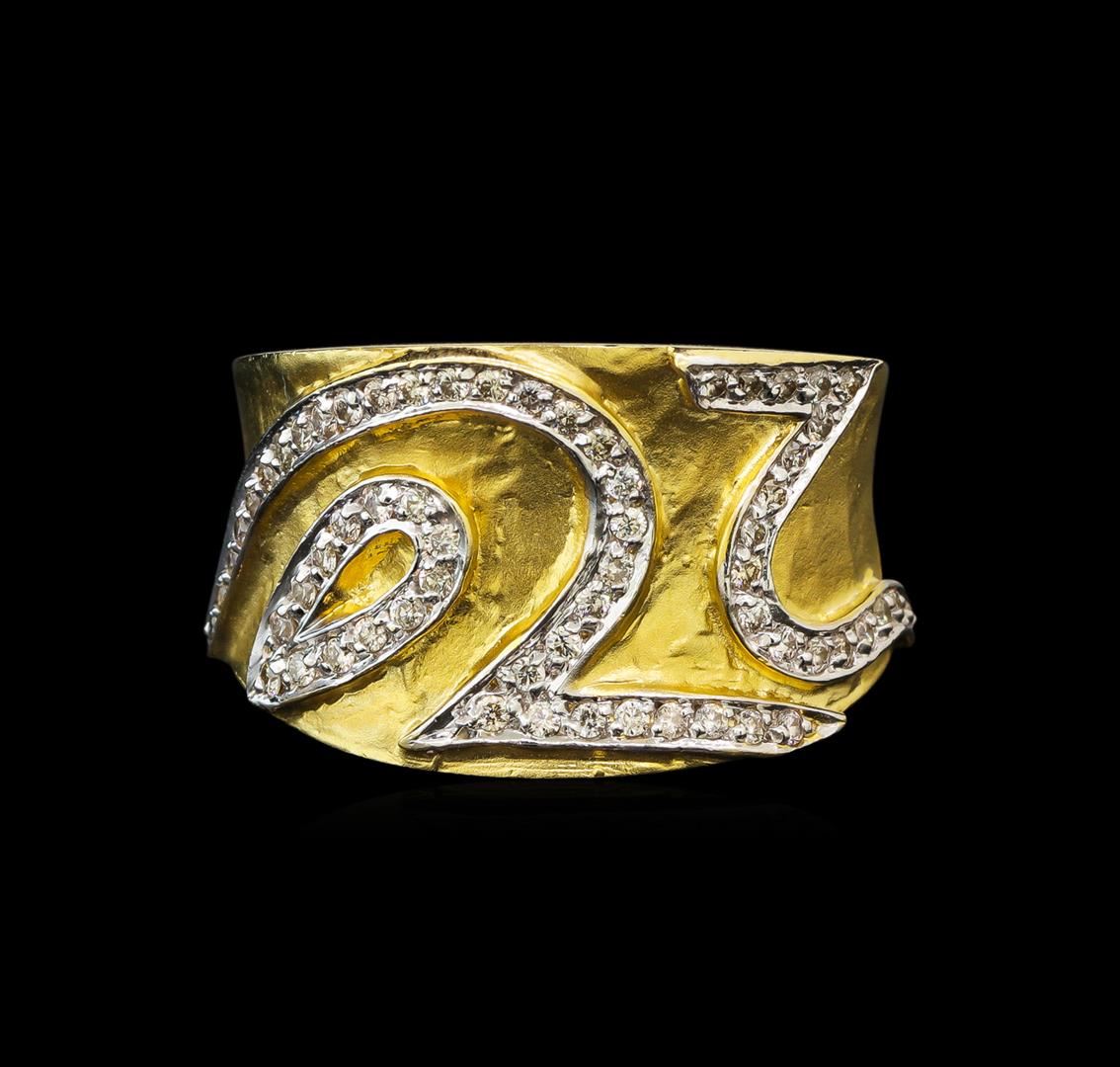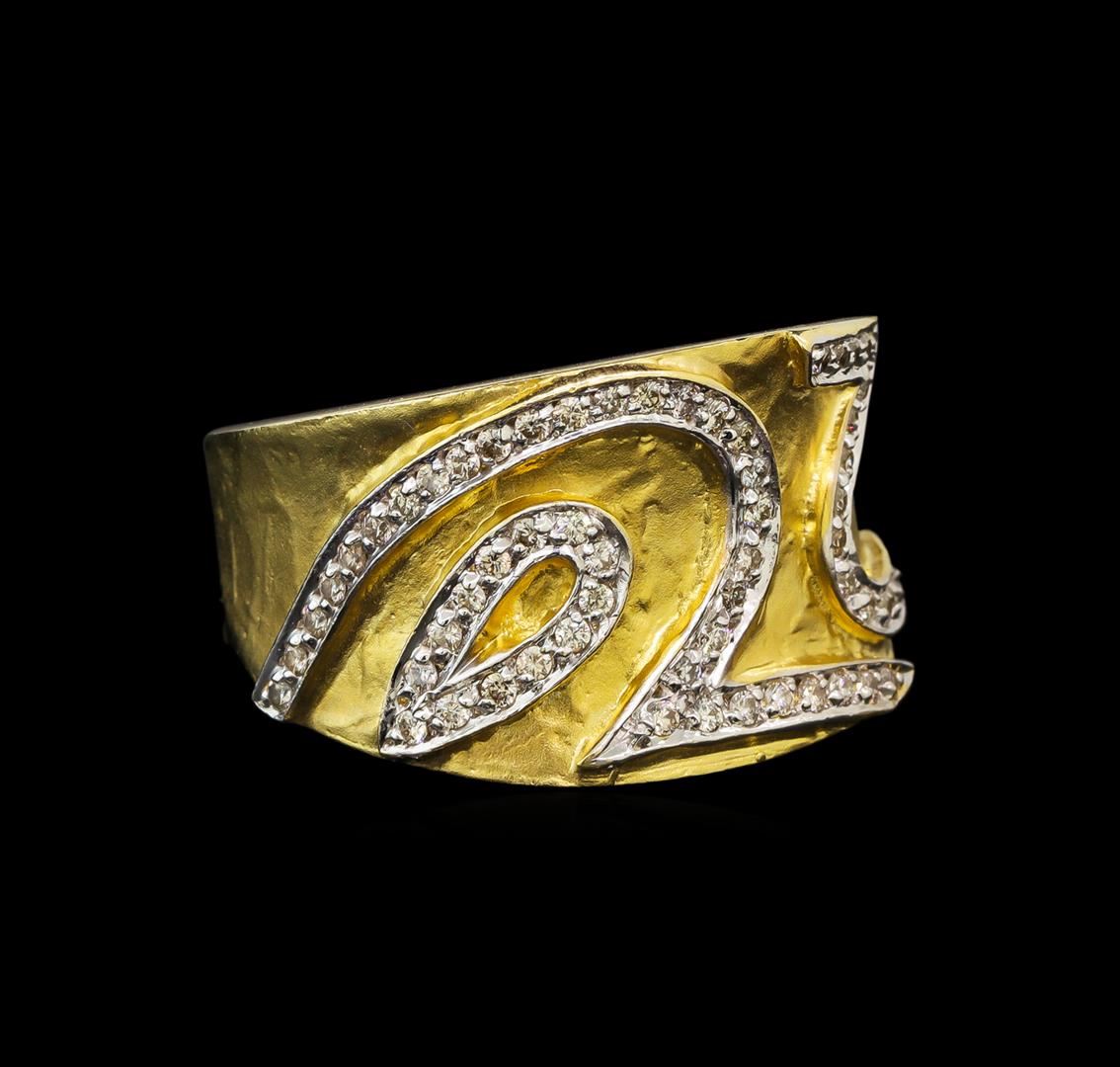 One electronically tested 14KT yellow and white gold ladies cast diamond ring with a bright and satin finish. The ring features a curvature with three stylized diamond ribbons, terminating in a four and one-half millimeter wide band. Identified with markings of "14K". Condition is good. Containing: Sixty-Two prong set round brilliant cut diamonds, measuring 1.60 - 1.40 x 0.90mm (depth est.) approximate total weight of 62 Stones = 0.86ct. Graded in the setting. Clarity: VS-1 to SI-1. Color: H - J. Total Weight of Diamonds 0.86ct. Total Weight of Ring 14.98 grams. AIG Appraised at $5,570.00.