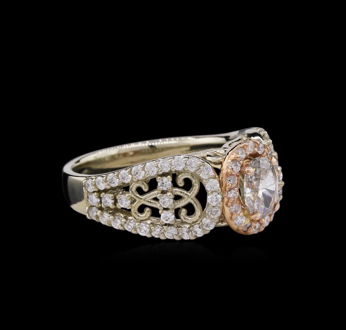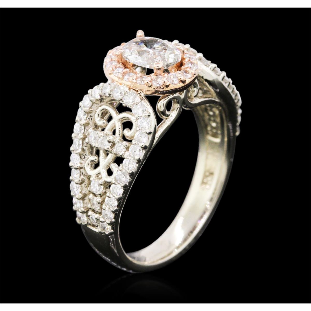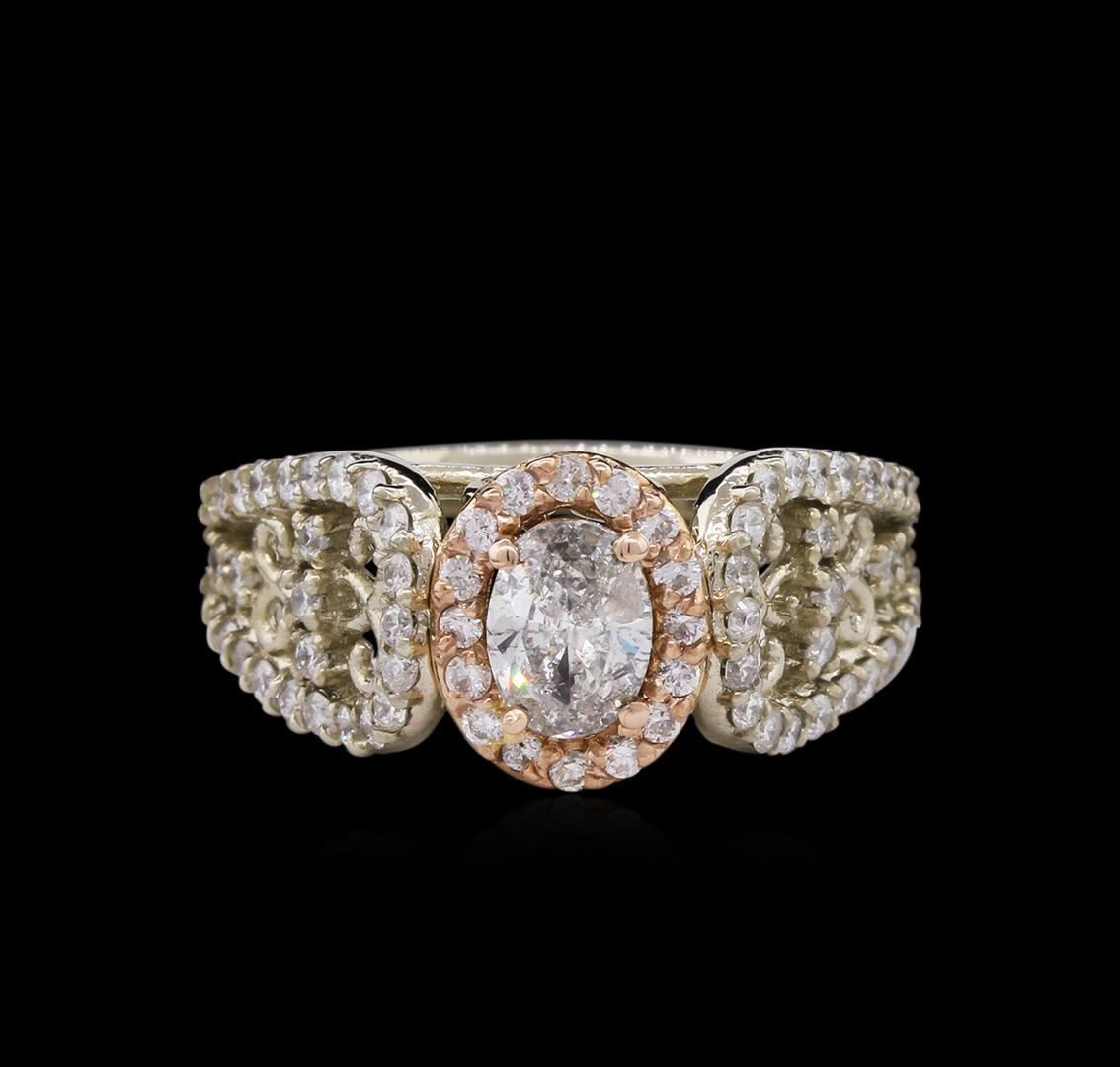 One electronically tested 14KT white and rose gold ladies cast diamond engagement ring with a bright polish finish. Identified with markings of "K14". Condition is new. Containing: One prong set oval shaped cut diamond, measuring 6.36 x 4.85 x 2.76mm (depth est.) approximate weight of 0.54ct. Clarity: I-2. Color: H, Cut is Good. Seventy-Three prong set round brilliant cut diamonds, measuring 1.30 - 1.30 x 0.78mm (depth est.) approximate total weight of 73 Stones = 0.58ct. Clarity: SI-2 to I-1. Color: H - I, Cut is Good. All diamonds are graded in the mounting, unless otherwise stated. Total Weight of Diamonds 1.12ct. Total Weight of Ring 6.20 grams. GGL Appraised at $5,675.00.