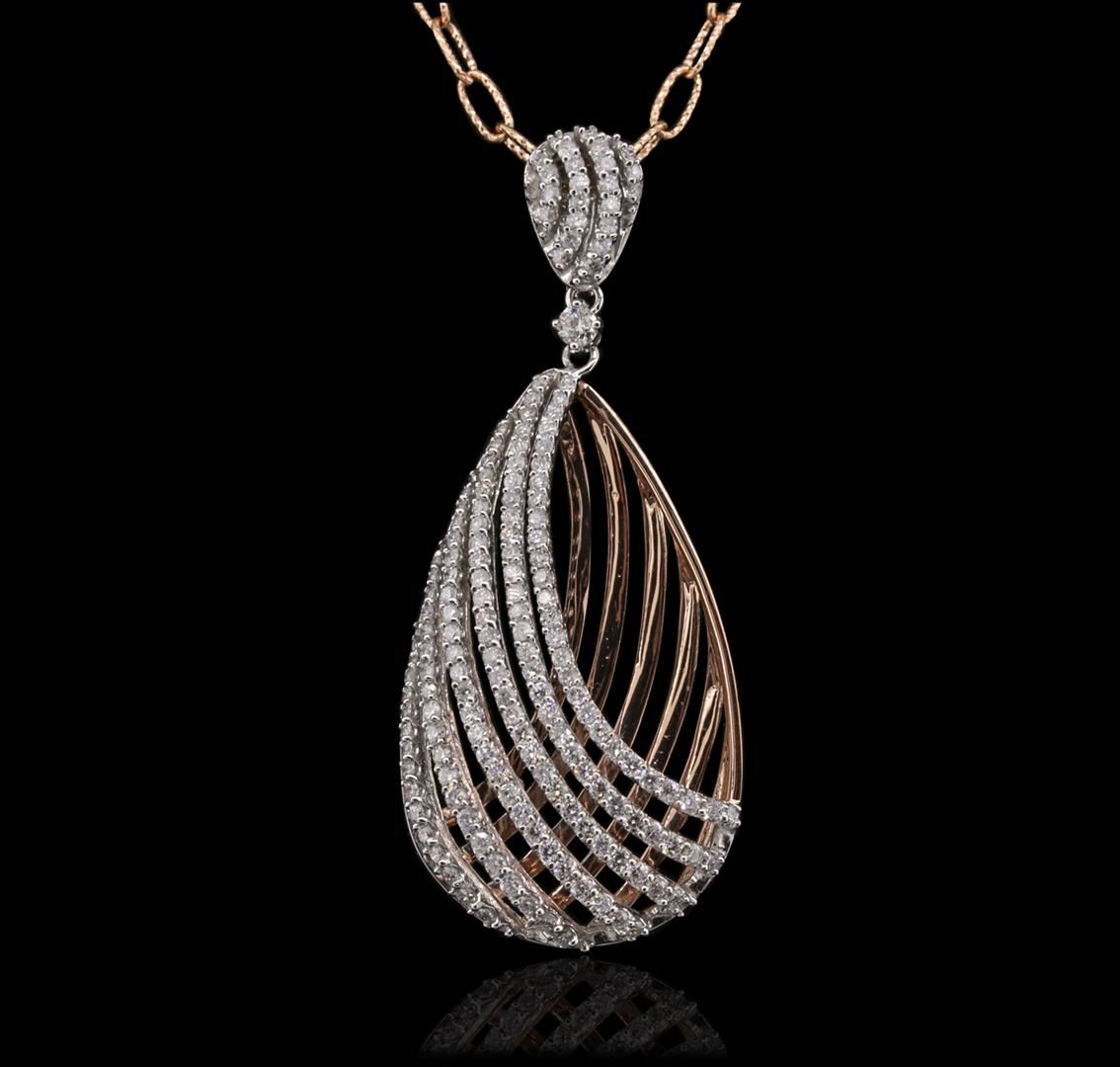 One electronically tested 14KT rose and white gold ladies combination cast & die struck pendant & chain 18.0" long, medium cable link with a lobster claw clasp with a bright polish finish. Condition is new. Identified with markings of "K14-585". Containing: One Hundred Forty-Three prong set round brilliant cut diamonds, measuring 1.30 - 1.30 x 0.78mm (depth est.) approximate. Total Weight of 143 Stones = 1.14ct. Clarity: I-1 to I-2. Color: I - K, Cut is Good. All diamonds are graded in the mounting, unless otherwise stated. Total Weight of Diamonds 1.14ct. Total Weight of Pendant & Chain 10.10 grams. GGL Appraised at $6,500.00.