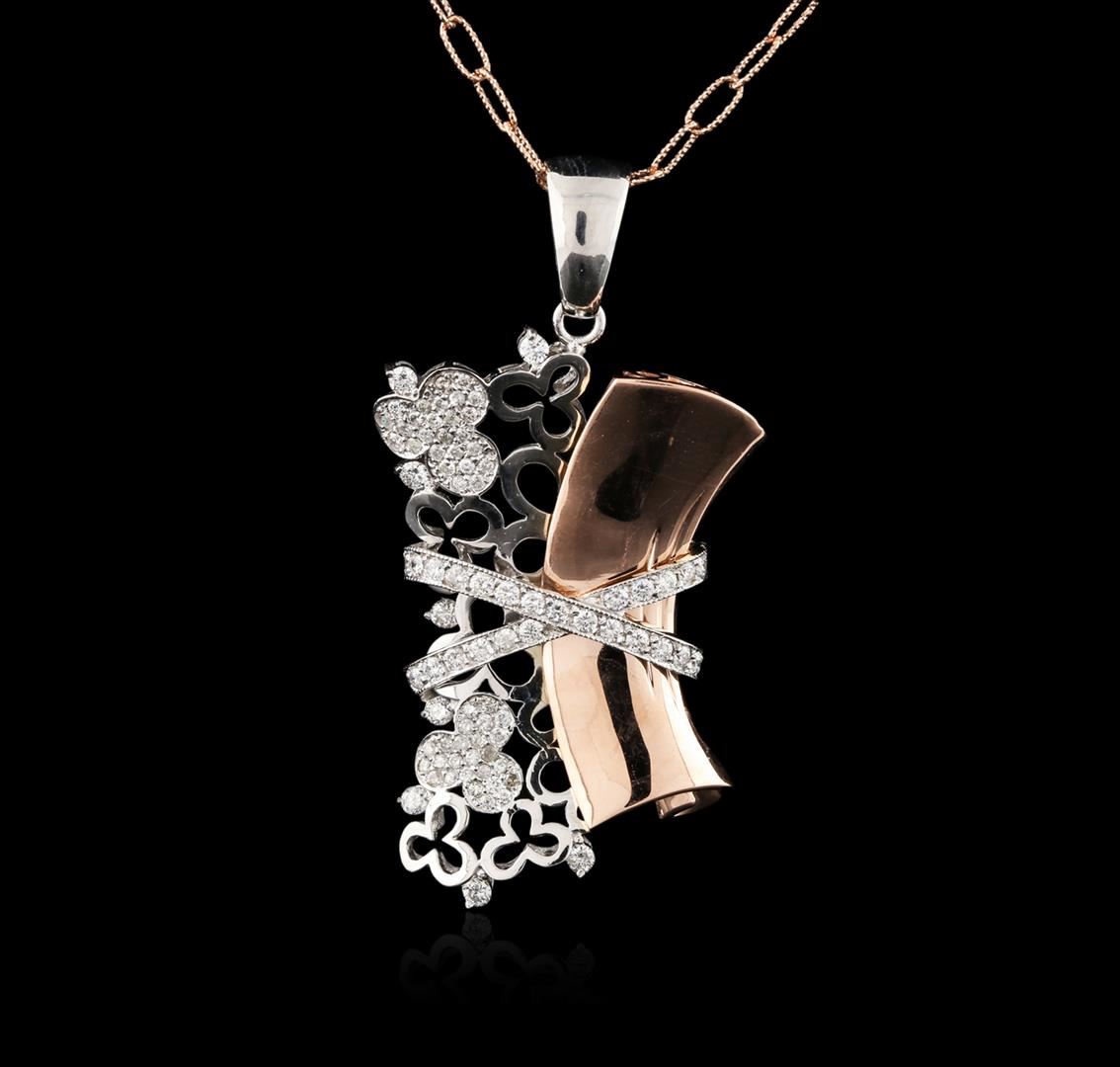One electronically tested 14KT white and rose gold ladies cast & assembled diamond pendant with chain. The pendant features a rose gold scroll and a white gold diamond set floral lattice combined by intertwining diamond ribbons, completed by a white gold bail. The pendant is supported by an eighteen inch length 14KT rose gold designer style link chain, terminating in a lobster claw clasp. Bright polish finish with milgrain detailing. Identified with markings of "14K". Condition is new, good workmanship. Containing: Thirty-Five prong set round brilliant cut diamonds, measuring 2.00 - 1.80 x 1.14mm (depth est.) approximate total weight of 35 Stones = 0.98ct. Graded in the setting. Clarity: SI-1 to I-1. Color: G - I Fifty-Three bead set round brilliant cut diamonds, measuring 1.30 - 1.20 x 0.75mm (depth est.) approximate total weight of 53 Stones = 0.47ct. Graded in the setting. Clarity: I-1 to I-3. Color: H - J. Total Weight of Diamonds 1.45ct. Total Weight of Pendant With Chain 13.35 grams. AIG Appraised at $5,855.00.