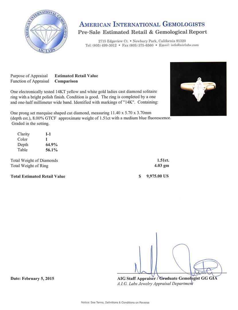 One electronically tested 14KT yellow and white gold ladies cast diamond solitaire ring with a bright polish finish. The ring is completed by a one and one-half millimeter wide band. Identified with markings of "14K". Condition is good. Containing: One prong set marquise shaped cut diamond, measuring 11.40 x 5.70 x 3.70mm (depth est.), 8.00.%. GTCF approximate weight of 1.51ct with a medium blue fluorescence. Graded in the setting. Clarity: I-1. Color: I. Depth 64.9%. Table 56.1%. Total Weight of Diamonds 1.51ct. Total Weight of Ring 4.03 grams. AIG Appraised at $9,975.00.
