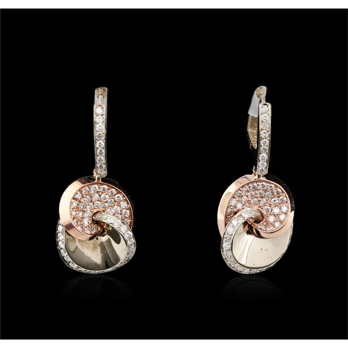 One pair electronically tested 14KT white and rose gold ladies cast diamond earrings with hinged clip backs with a bright polish finish. Identified with markings of "14K". Condition is new. Containing: One Hundred Twenty-Four prong set round brilliant cut diamonds, measuring 1.50 - 1.50 x 0.90mm (depth est.) approximate total weight of 124 Stones = 1.53ct. Clarity: SI-1 to SI-2. Color: G - H, Cut is Good. All diamonds are graded in the mounting, unless otherwise stated. Total Weight of Diamonds 1.53ct. Total Weight of Earrings 8.50 grams. GGL Appraised at $5,760.00.