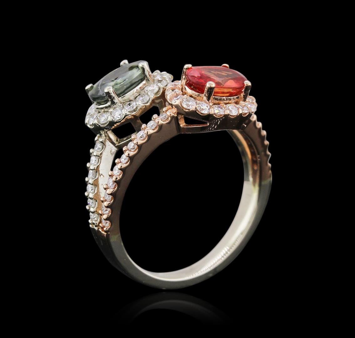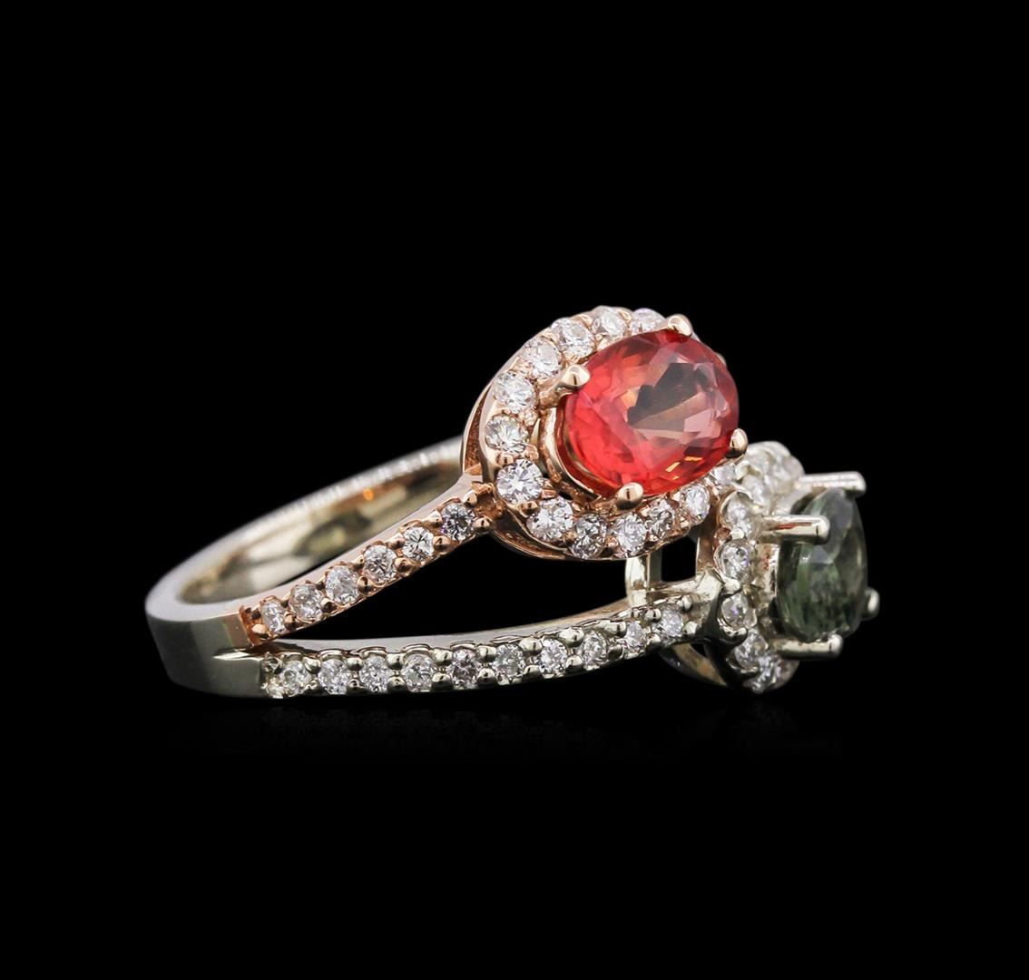One electronically tested 14KT white and rose gold ladies cast sapphire and diamond ring with a split shoulder shank with a bright polish finish. Identified with markings of "K14". Condition is new. Containing: One prong set oval modified brilliant cut natural green sapphire, measuring 7.06 x 4.93 x 2.47mm, approximate weight of 0.72ct., clarity is slightly included, type II, medium light, slightly grayish, bluish green color, (GIA bG 4/2), cut is good. One prong set oval modified brilliant cut natural orange sapphire, measuring 6.75 x 4.94 x 2.95mm, approximate weight of 0.83ct., clarity is eye clean, type II, medium light, slightly brownish, orange color, (GIA O 4/2), cut is good. Sixty-Four prong set round brilliant cut diamonds, measuring 1.30 - 1.20 x 0.75mm (depth est.) approximate total weight of 64 Stones = 0.67ct. Clarity: SI-1 to SI-2. Color: I - J, Cut is Good. All diamonds and colored gemstones are graded in the mounting, unless otherwise stated. Colored gemstones are presumed to have been subjected to commonly used enhancement processes. Total Weight of Colored Stones 1.55ct. Total Weight of Diamonds 0.67ct. Total Weight of Ring 4.80 grams. GGL Appraised at $2,685.00.