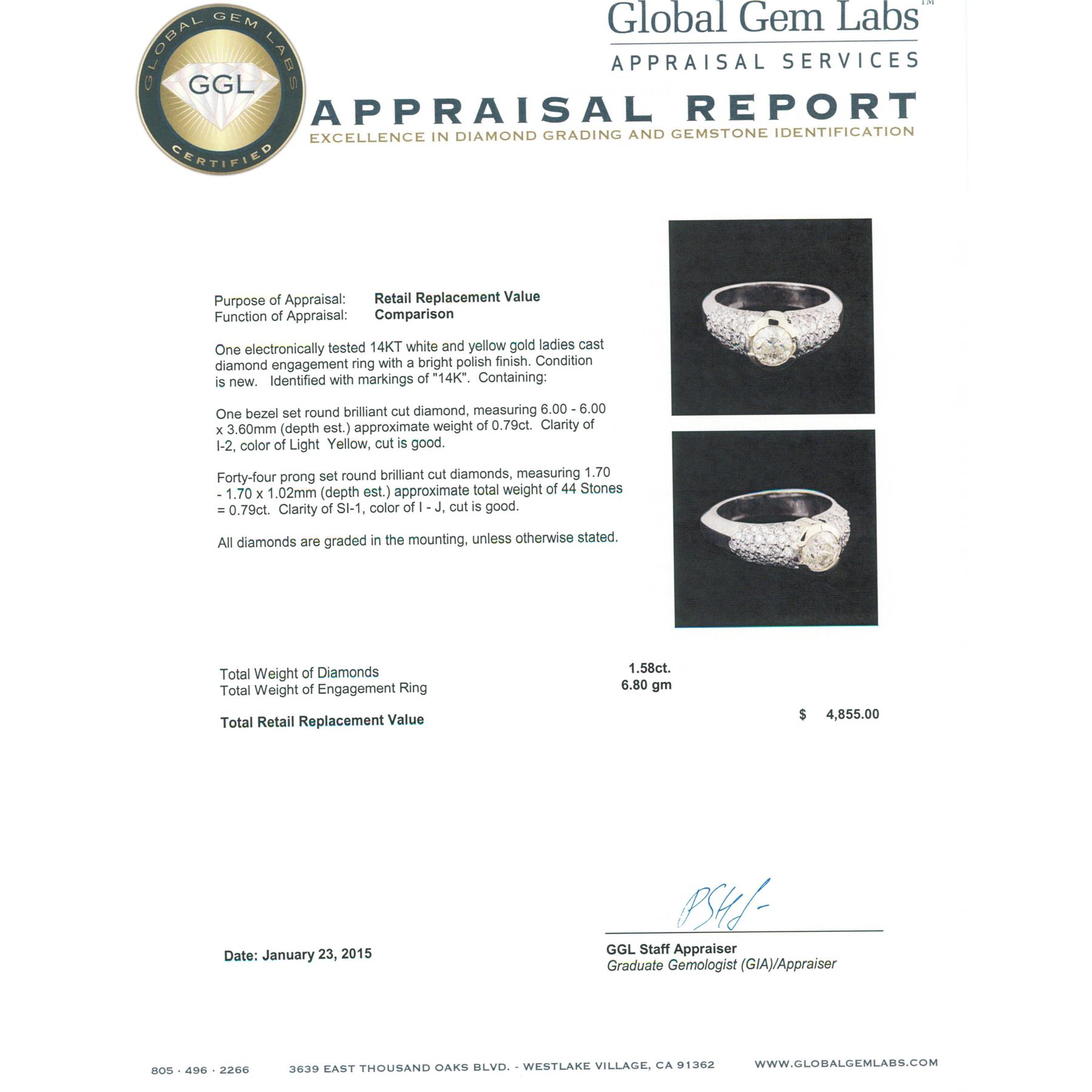One electronically tested 14KT white and yellow gold ladies cast diamond engagement ring with a bright polish finish. Identified with markings of "14K". Condition is new. Containing: One bezel set round brilliant cut diamond, measuring 6.00 - 6.00 x 3.60mm (depth est.) approximate weight of 0.79ct. Clarity: I-2, Cut is Good. Forty-Four prong set round brilliant cut diamonds, measuring 1.70 - 1.70 x 1.02mm (depth est.) approximate total weight of 44 Stones = 0.79ct. Clarity: SI-1. Color: I - J, Cut is Good. All diamonds are graded in the mounting, unless otherwise stated. Total Weight of Diamonds 1.58ct. Total Weight of Engagement Ring 6.80 grams. GGL Appraised.