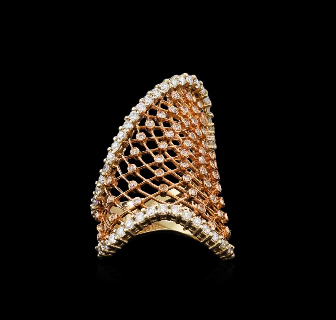 One electronically tested 14KT white and rose gold ladies cast diamond ring with a bright polish finish. Identified with markings of "14K". Condition is new. Containing: One Hundred Thirty-Eight prong set round brilliant cut diamonds, measuring 1.50 - 1.20 x 0.81mm (depth est.) approximate total weight of 138 Stones = 1.63ct. Clarity: I-1. Color: I - J, Cut is Good. All diamonds are graded in the mounting, unless otherwise stated. Total Weight of Diamonds 1.63ct. Total Weight of Ring 10.00 grams. GGL Appraised at $5,320.00.