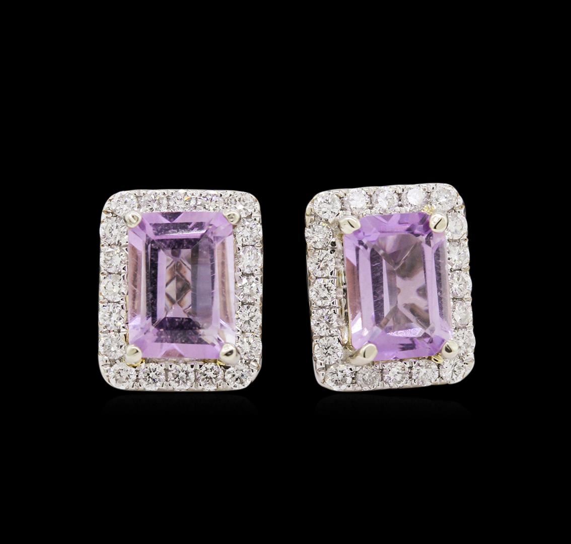 One pair electronically tested 14KT white and yellow gold Ladies combination cast & assembled stud earrings with friction posts with a bright polish finish. Condition is new. Identified with markings of "14K". Containing: Thirty-Eight prong set round brilliant cut diamonds, measuring 1.30 - 1.30 x 0.78mm (depth est.) approximate. Total Weight of 38 Stones = 0.45ct. Clarity: I-1 to I-2. Color: H - I, Cut is Good. Two prong set emerald standard step cut natural amethysts, measuring 7.00 x 5.00 x 3.25mm, approximate. Total Weight of 1.68ct., clarity is eye clean, type II, light, very slightly grayish, purple color, (GIA P 3/3), cut is good. Colored gemstones are presumed to have been subjected to commonly used color/clarity enhancement processes. Total Weight of Colored Stones 1.68ct. Total Weight of Diamonds 0.45ct. Total Weight of Earrings 3.40 grams. GGL Appraised at $2,355.00.