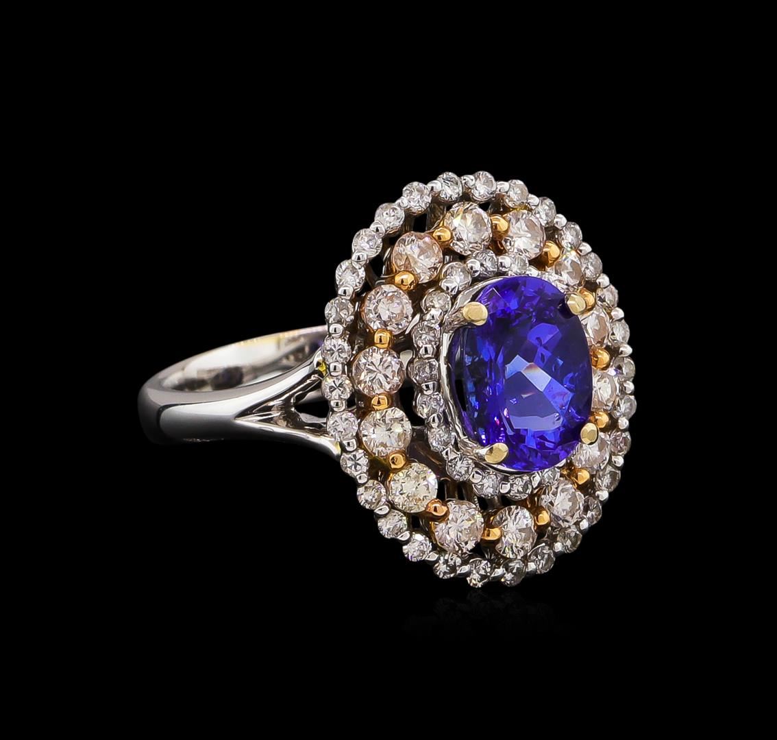 One electronically tested 14KT white and yellow gold Ladies combination cast & assembled ring with a bright polish finish. Condition is new. Identified with markings of "14K". Containing: One prong set oval modified brilliant cut natural tanzanite, measuring 8.60 x 6.40 x 4.60mm, approximate weight of 1.73ct., clarity is eye clean, type I, medium light, very slightly grayish, bluish violet color, (GIA bV 4/3), cut is good. Colored gemstones are presumed to have been subjected to commonly used color/clarity enhancement processes. Fourteen prong set round brilliant cut diamonds, measuring 2.20 - 2.20 x 1.32mm (depth est.) approximate. Total Weight of 14 Stones = 0.55ct. . Clarity: I-1. Color: I - J, Cut is Good. Forty-Eight prong set round brilliant cut diamonds, measuring 1.30 - 1.30 x 0.78mm (depth est.) approximate. Total Weight of 48 Stones = 0.38ct. . Clarity: I-1 to I-2. Color: I - J, Cut is Good. . Total Weight of Colored Stones 1.73ct. Total Weight of Diamonds 0.93ct. Total Weight of Ring 7.70 grams. GGL Appraised.