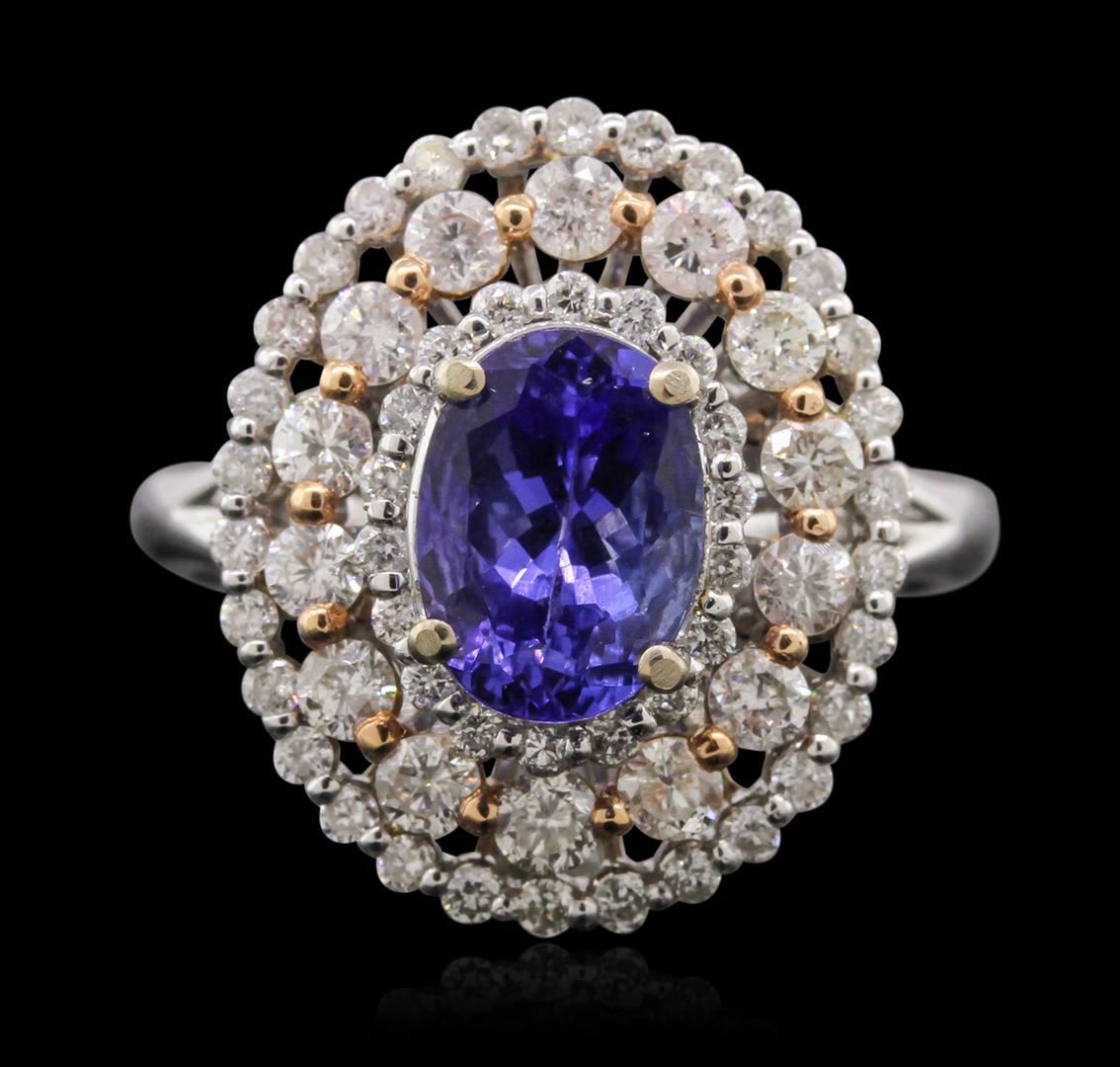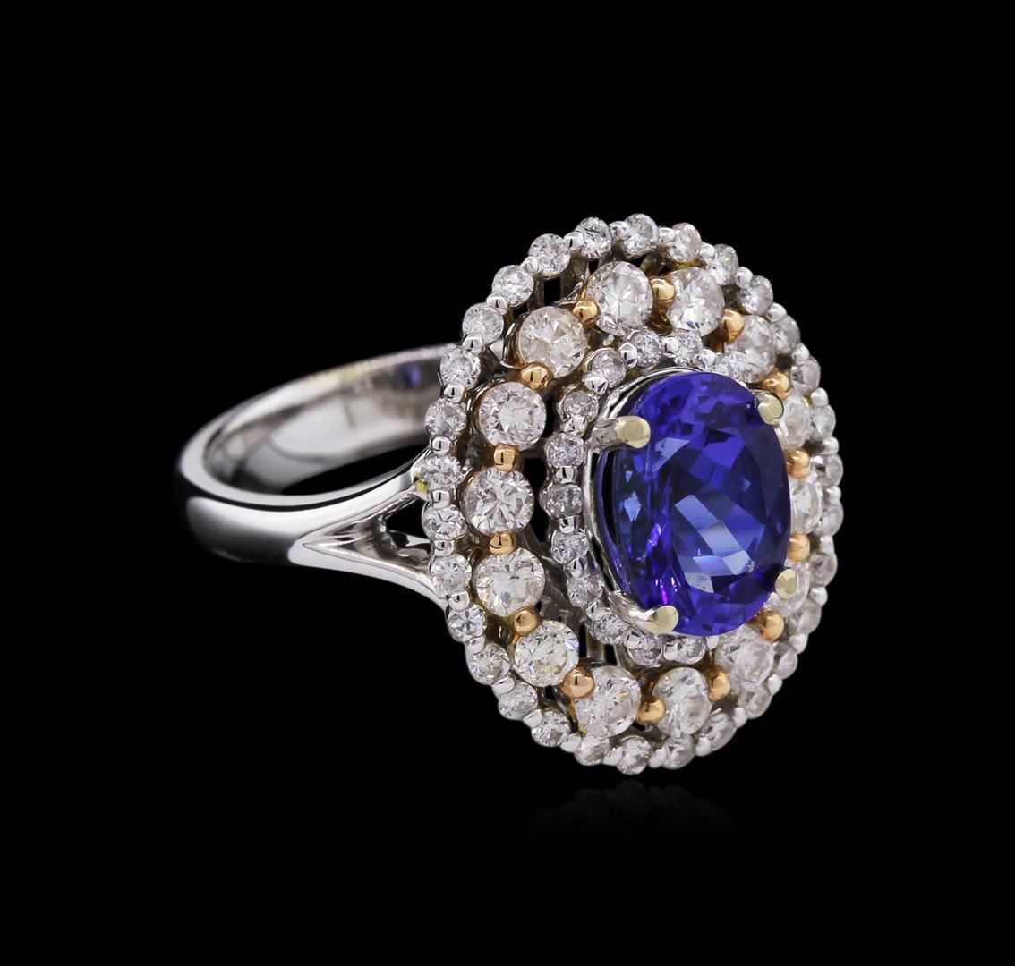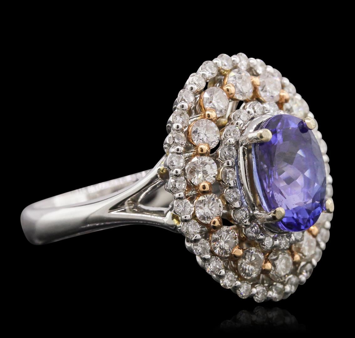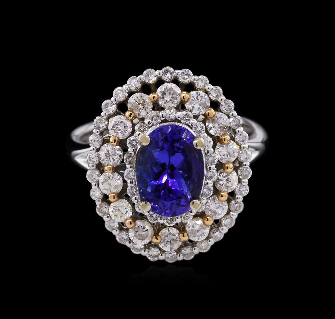 One electronically tested 14KT white and yellow gold Ladies combination cast & assembled ring with a bright polish finish. Condition is new. Identified with markings of "14K". Containing: One prong set oval modified brilliant cut natural tanzanite, measuring 8.60 x 6.40 x 4.60mm, approximate weight of 1.73ct., clarity is eye clean, type I, medium light, very slightly grayish, bluish violet color, (GIA bV 4/3), cut is good. Colored gemstones are presumed to have been subjected to commonly used color/clarity enhancement processes. Fourteen prong set round brilliant cut diamonds, measuring 2.20 - 2.20 x 1.32mm (depth est.) approximate. Total Weight of 14 Stones = 0.55ct. . Clarity: I-1. Color: I - J, Cut is Good. Forty-Eight prong set round brilliant cut diamonds, measuring 1.30 - 1.30 x 0.78mm (depth est.) approximate. Total Weight of 48 Stones = 0.38ct. . Clarity: I-1 to I-2. Color: I - J, Cut is Good. . Total Weight of Colored Stones 1.73ct. Total Weight of Diamonds 0.93ct. Total Weight of Ring 7.70 grams. GGL Appraised at $7,040.00.