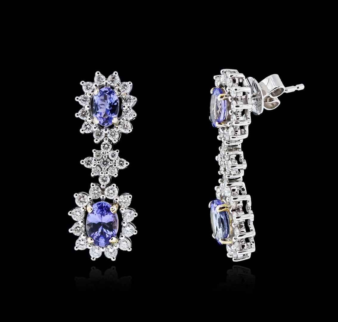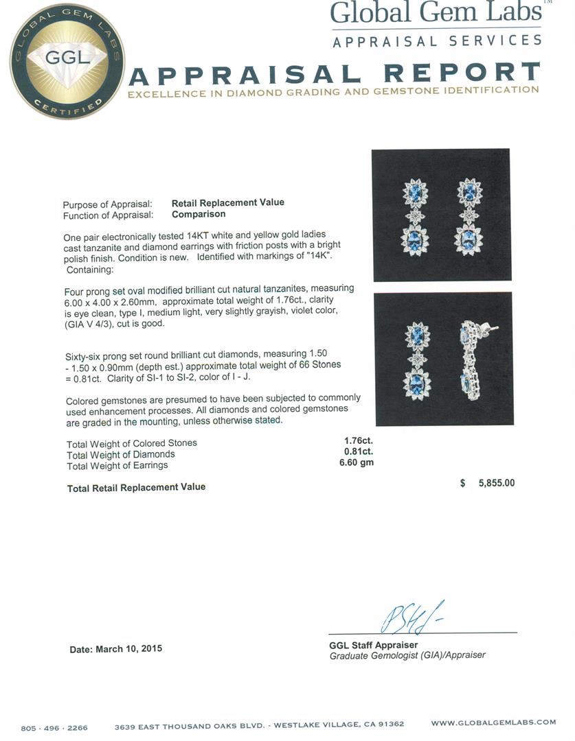 One pair electronically tested 14KT white and yellow gold ladies cast tanzanite and diamond earrings with friction posts with a bright polish finish. Identified with markings of "14K". Condition is new. Containing: Four prong set oval modified brilliant cut natural tanzanites, measuring 6.00 x 4.00 x 2.60mm, approximate total weight of 1.76ct., clarity is eye clean, type I, medium light, very slightly grayish, violet color, (GIA V 4/3), cut is good. Sixty-Six prong set round brilliant cut diamonds, measuring 1.50 - 1.50 x 0.90mm (depth est.) approximate total weight of 66 Stones = 0.81ct. Clarity: SI-1 to SI-2. Color: I - J. Colored gemstones are presumed to have been subjected to commonly used enhancement processes. All diamonds and colored gemstones are graded in the mounting, unless otherwise stated. Total Weight of Colored Stones 1.76ct. Total Weight of Diamonds 0.81ct. Total Weight of Earrings 6.60 grams. GGL Appraised at $5,855.00.