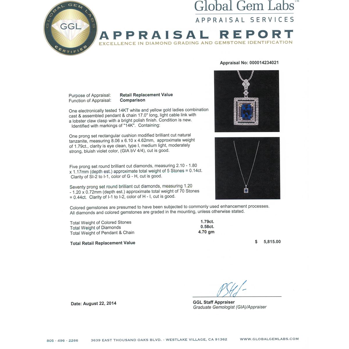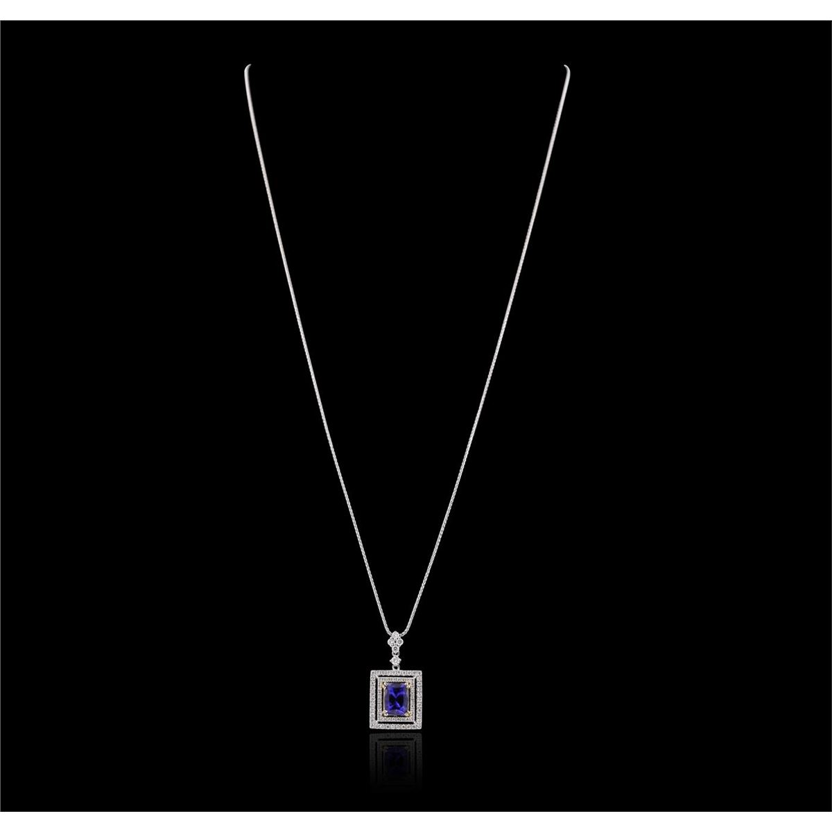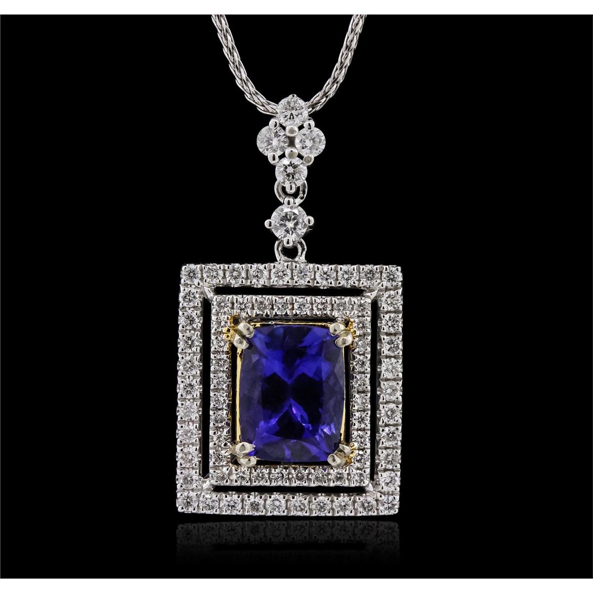 One electronically tested 14KT white and yellow gold ladies combination cast & assembled pendant & chain 17.0" long, light cable link with a lobster claw clasp with a bright polish finish. Identified with markings of "14K". Condition is new. Containing: One prong set rectangular cushion modified brilliant cut natural tanzanite, measuring 8.06 x 6.10 x 4.62mm, approximate weight of 1.79ct., clarity is eye clean, type I, medium light, moderately strong, bluish violet color, (GIA bV 4/4), cut is good. Five prong set round brilliant cut diamonds, measuring 2.10 - 1.80 x 1.17mm (depth est.) approximate total weight of 5 Stones = 0.14ct. Clarity: SI-2 to I-1. Color: G - H, Cut is Good. Seventy prong set round brilliant cut diamonds, measuring 1.20 - 1.20 x 0.72mm (depth est.) approximate total weight of 70 Stones = 0.44ct. Clarity: I-1 to I-2. Color: H - I, Cut is Good. Colored gemstones are presumed to have been subjected to commonly used enhancement processes. All diamonds and colored gemstones are graded in the mounting, unless otherwise stated. Total Weight of Colored Stones 1.79ct. Total Weight of Diamonds 0.58ct. Total Weight of Pendant & Chain 4.70 grams. GGL Appraised at $5,815.00.
