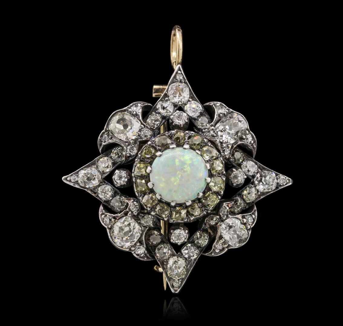 One electronically tested 14KT white and yellow gold ladies hand made brooch with a bright polish finish. Condition is very good. Containing: One white opal that is cut in a round shape and is prong set, measuring 9.20 mm long x 9.20 mm wide, and 3.00 mm thick and the approximate weight is 0.98 carats. The opal has a bright, orange-green play of color (fire) in a pinfire pattern; a low dome; a good cut; no inclusions; consistent in its brightness and pattern; and is somewhat directional. Four prong set old mine cut diamonds, measuring 5.50 - 3.80 x 2.88mm (depth est.) approximate. Total Weight of 4 Stones = 1.52ct. Clarity: I-1. Color: I - J. Forty-One prong set old mine cut diamonds, measuring 2.80 - 2.00 x 1.49mm (depth est.) approximate. Total Weight of 41 Stones = 2.14ct. Clarity: SI-2 to I-1. Color: I - J. Fourteen prong set old mine cut diamonds, measuring 2.00 - 2.00 x 1.24mm (depth est.) approximate. Total Weight of 14 Stones = 0.42ct. Clarity: SI-2 to I-1. All diamonds are graded in the mounting, unless otherwise stated. Total Weight of Diamonds 4.09ct. Total Weight of Opals 0.98ct. Total Weight of Brooch 13.50 grams. GGL Appraised at $14,465.00.