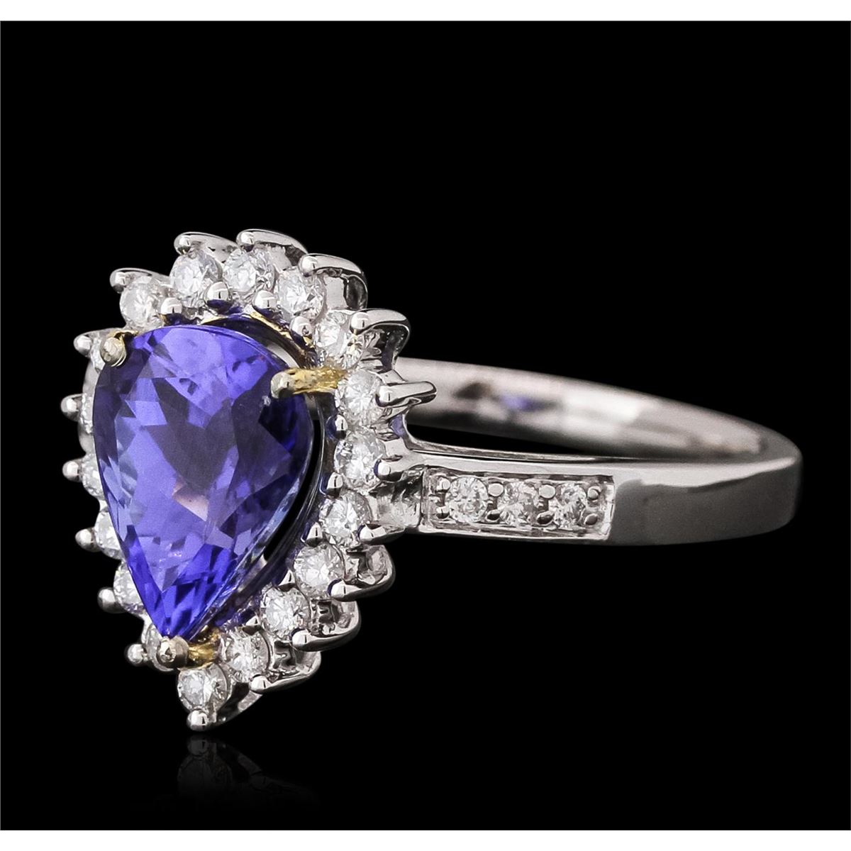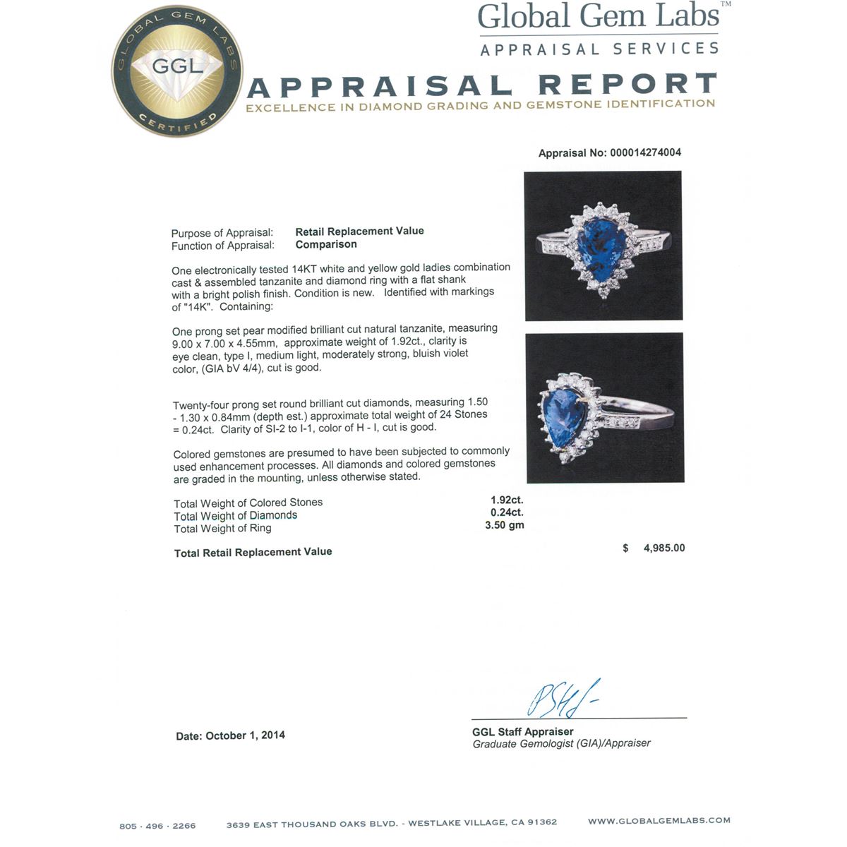 One electronically tested 14KT white and yellow gold ladies combination cast & assembled tanzanite and diamond ring with a flat shank with a bright polish finish. Identified with markings of "14K". Condition is new. Containing: One prong set pear modified brilliant cut natural tanzanite, measuring 9.00 x 7.00 x 4.55mm, approximate weight of 1.92ct., clarity is eye clean, type I, medium light, moderately strong, bluish violet color, (GIA bV 4/4), cut is good. Twenty-Four prong set round brilliant cut diamonds, measuring 1.50 - 1.30 x 0.84mm (depth est.) approximate total weight of 24 Stones = 0.24ct. Clarity: SI-2 to I-1. Color: H - I, Cut is Good. Colored gemstones are presumed to have been subjected to commonly used enhancement processes. All diamonds and colored gemstones are graded in the mounting, unless otherwise stated. Total Weight of Colored Stones 1.92ct. Total Weight of Diamonds 0.24ct. Total Weight of Ring 3.50 grams. GGL Appraised at $4,985.00.