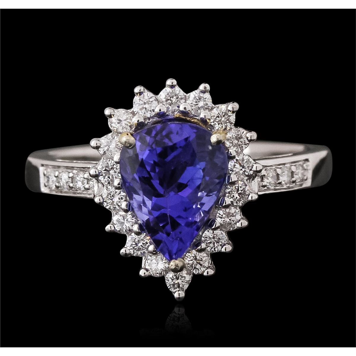 One electronically tested 14KT white and yellow gold ladies combination cast & assembled tanzanite and diamond ring with a flat shank with a bright polish finish. Identified with markings of "14K". Condition is new. Containing: One prong set pear modified brilliant cut natural tanzanite, measuring 9.00 x 7.00 x 4.55mm, approximate weight of 1.92ct., clarity is eye clean, type I, medium light, moderately strong, bluish violet color, (GIA bV 4/4), cut is good. Twenty-Four prong set round brilliant cut diamonds, measuring 1.50 - 1.30 x 0.84mm (depth est.) approximate total weight of 24 Stones = 0.24ct. Clarity: SI-2 to I-1. Color: H - I, Cut is Good. Colored gemstones are presumed to have been subjected to commonly used enhancement processes. All diamonds and colored gemstones are graded in the mounting, unless otherwise stated. Total Weight of Colored Stones 1.92ct. Total Weight of Diamonds 0.24ct. Total Weight of Ring 3.50 grams. GGL Appraised at $4,985.00.