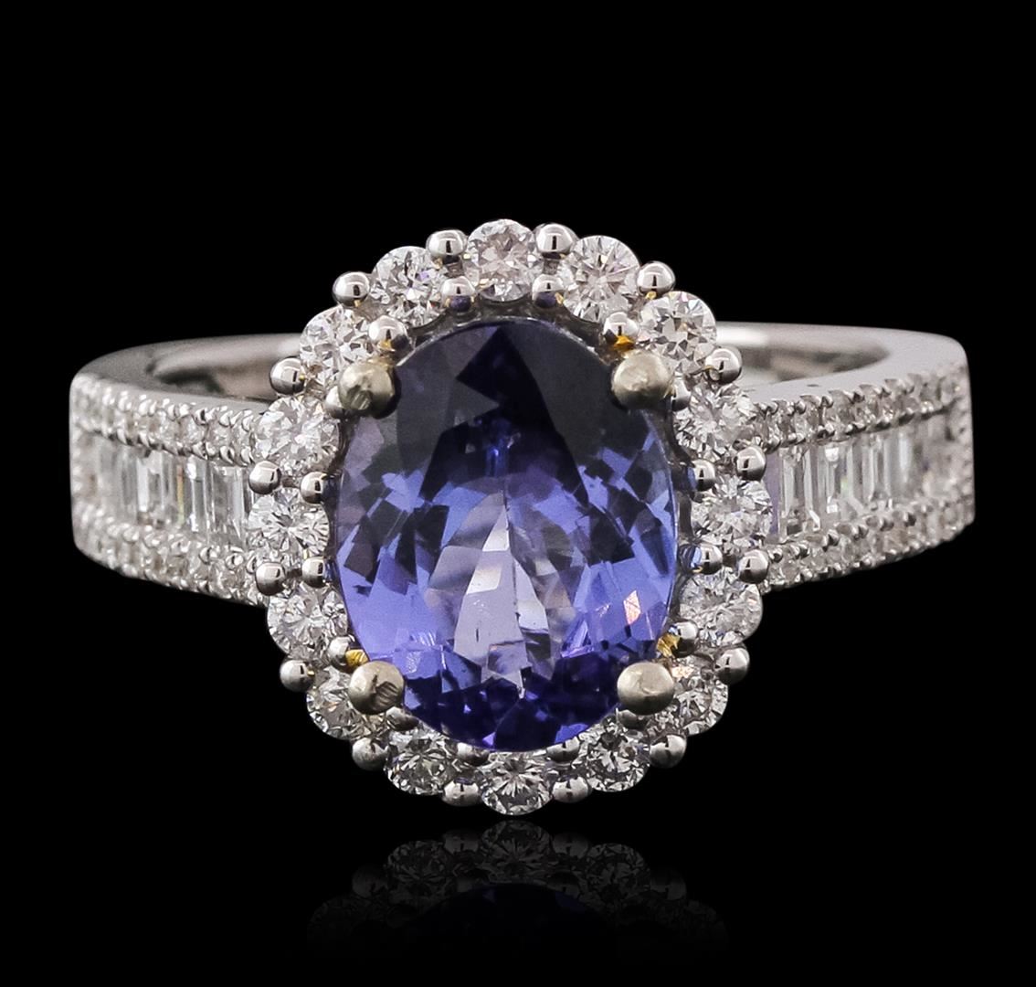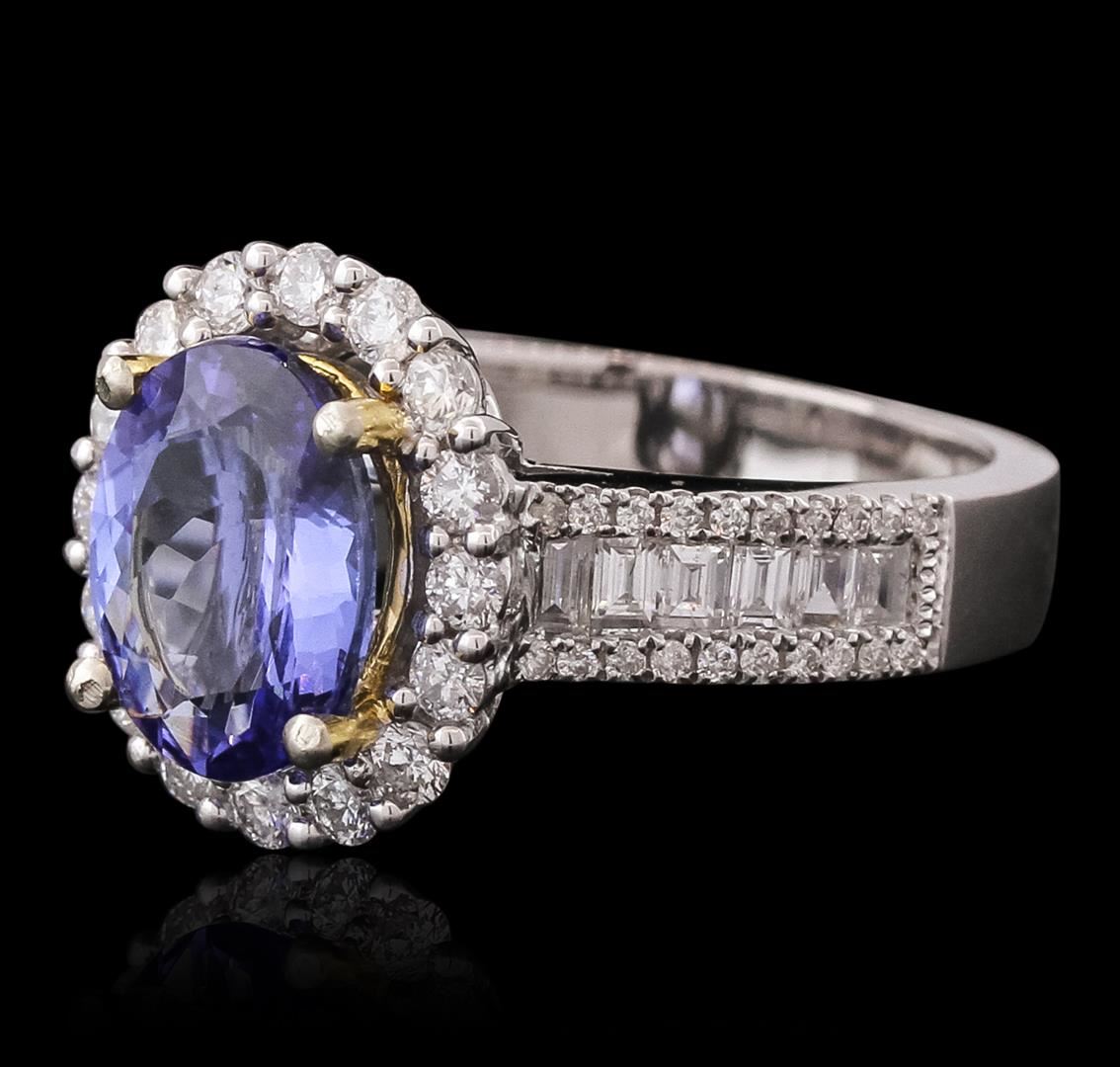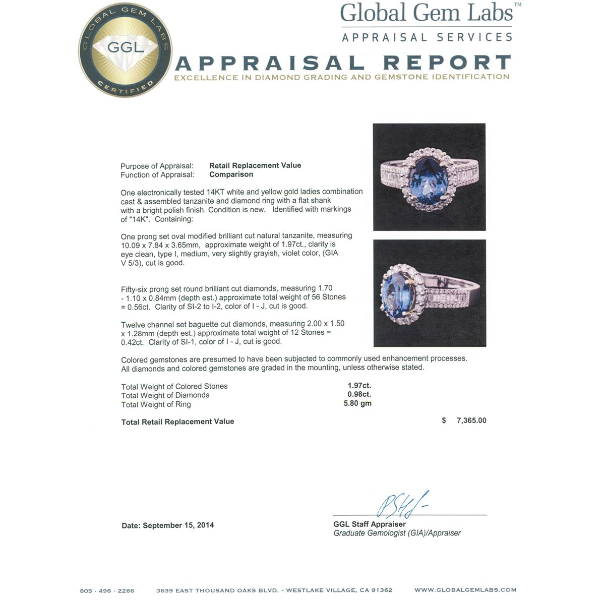 One electronically tested 14KT white and yellow gold ladies combination cast & assembled tanzanite and diamond ring with a flat shank with a bright polish finish. Identified with markings of "14K". Condition is new. Containing: One prong set oval modified brilliant cut natural tanzanite, measuring 10.09 x 7.84 x 3.65mm, approximate weight of 1.97ct., clarity is eye clean, type I, medium, very slightly grayish, violet color, (GIA V 5/3), cut is good. Fifty-Six prong set round brilliant cut diamonds, measuring 1.70 - 1.10 x 0.84mm (depth est.) approximate total weight of 56 Stones = 0.56ct. Clarity: SI-2 to I-2. Color: I - J, Cut is Good. Twelve channel set baguette cut diamonds, measuring 2.00 x 1.50 x 1.28mm (depth est.) approximate total weight of 12 Stones = 0.42ct. Clarity: SI-1. Color: I - J, Cut is Good. Colored gemstones are presumed to have been subjected to commonly used enhancement processes. All diamonds and colored gemstones are graded in the mounting, unless otherwise stated total weight of Colored Stones 1.97ct. Total Weight of Diamonds 0.98ct. Total Weight of Ring 5.80 grams. GGL Appraised at $7,365.00.