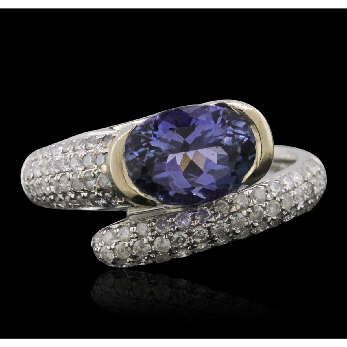 One electronically tested 14KT white and yellow gold ladies combination cast & assembled tanzanite and diamond ring with a flat shank with a bright polish finish. Identified with markings of "14K". Condition is new. Containing: One prong set oval modified brilliant cut natural tanzanite, measuring 9.84 x 6.84 x 4.27mm, approximate weight of 1.99ct., clarity is eye clean, type I, medium, moderately strong, violet color, (GIA V 5/4), cut is good. Eighty-Two prong set round brilliant cut diamonds, measuring 1.00 - 1.00 x 0.60mm (depth est.) approximate total weight of 82 Stones = 0.30ct. Clarity: I-1 to I-2. Color: I - J, Cut is Good. Colored gemstones are presumed to have been subjected to commonly used enhancement processes. All diamonds and colored gemstones are graded in the mounting, unless otherwise stated. Total Weight of Colored Stones 1.99ct. Total Weight of Diamonds 0.30ct. Total Weight of Ring 4.80 grams. GGL Appraised at $5,175.00.