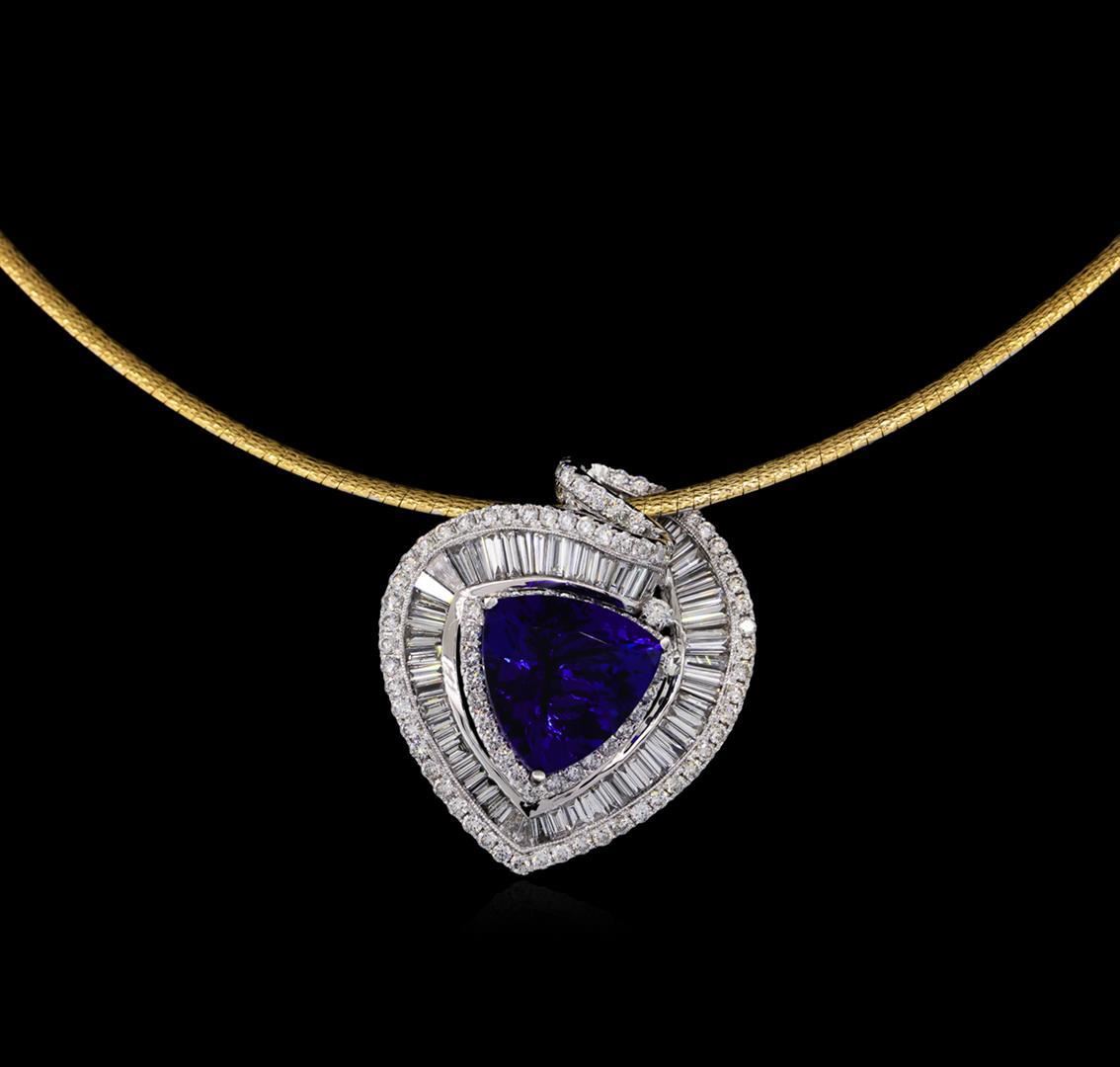 One electronically tested 14KT white and yellow gold ladies combination cast & assembled pendant & necklace with a lobster claw clasp with a bright polish finish. Necklace: 12" in length. Identified with markings of "14K". Condition is new. Containing: One prong set triangle modified brilliant cut natural tanzanite, measuring 14.30 x 14.42 x 8.55mm, approximate weight of 10.88ct., clarity is eye clean, type I, medium, moderately strong, bluish violet color, (GIA bV 5/4), cut is very good. Graded loose prior to setting by GIA Gemological Laboratory. GIA Report: #1166453352. Sixty channel set baguette cut diamonds, measuring from 2.00 x 1.50 x 1.28mm (depth est.) to 4.00 x 1.50 x 1.28mm (depth est.) approximate total weight of 60 Stones = 6.12ct. Clarity: VS-1 to VS-2. Color: H - I, Cut is Good. One Hundred prong set round brilliant cut diamonds, measuring 2.00 - 1.50 x 1.05mm (depth est.) approximate total weight of 100 Stones = 1.10 ct. Clarity: SI-1 to SI-2. Color: G - H, Cut is Good. Colored gemstones are presumed to have been subjected to commonly used enhancement processes. All diamonds and colored gemstones are graded in the mounting, unless otherwise stated. Total Weight of Colored Stones 10.88ct. Total Weight of Diamonds 7.22ct. Total Weight of Pendant & Necklace 24.90 grams. GGL Appraised.