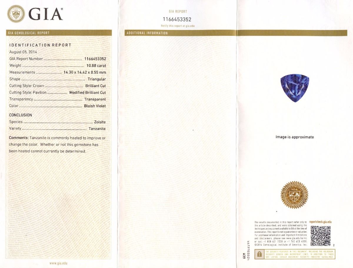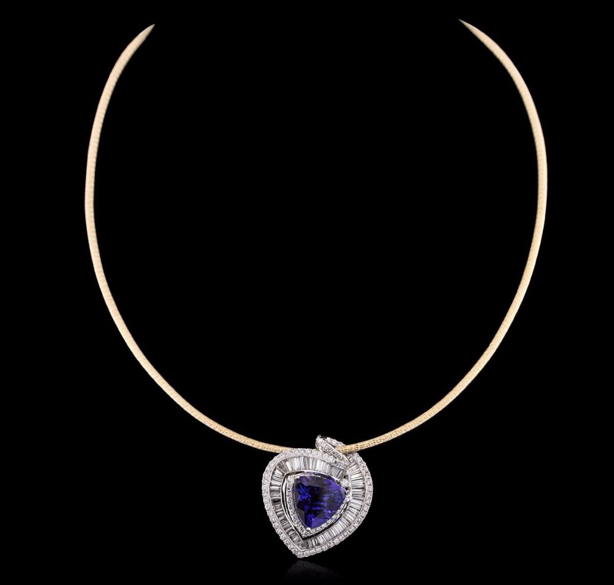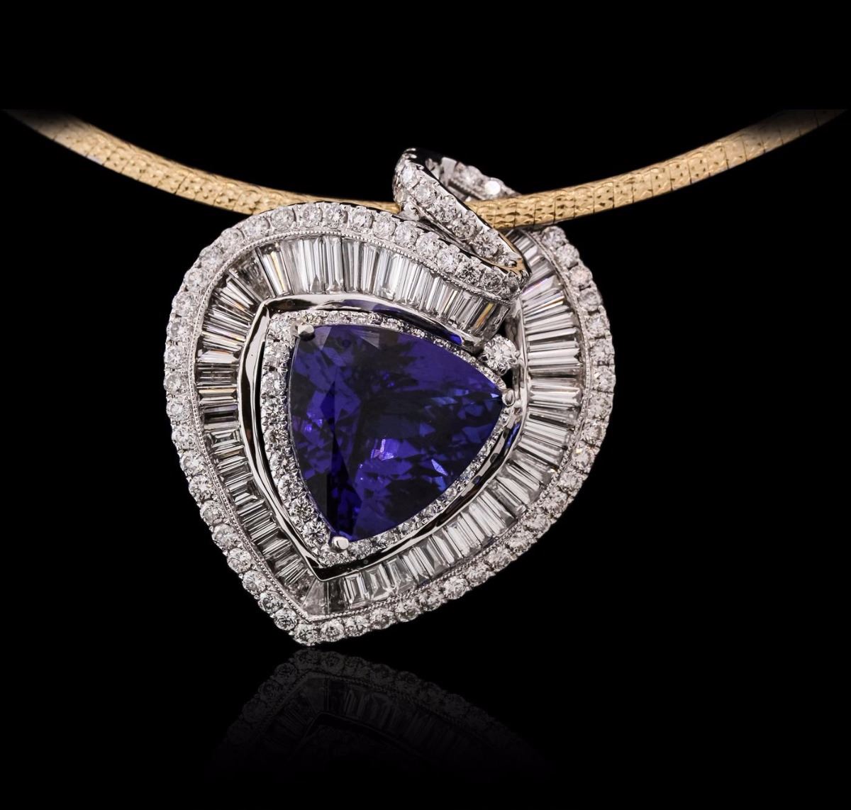 One electronically tested 14KT white and yellow gold ladies combination cast & assembled pendant & necklace with a lobster claw clasp with a bright polish finish. Necklace: 12" in length. Identified with markings of "14K". Condition is new. Containing: One prong set triangle modified brilliant cut natural tanzanite, measuring 14.30 x 14.42 x 8.55mm, approximate weight of 10.88ct., clarity is eye clean, type I, medium, moderately strong, bluish violet color, (GIA bV 5/4), cut is very good. Graded loose prior to setting by GIA Gemological Laboratory. GIA Report: #1166453352. Sixty channel set baguette cut diamonds, measuring from 2.00 x 1.50 x 1.28mm (depth est.) to 4.00 x 1.50 x 1.28mm (depth est.) approximate total weight of 60 Stones = 6.12ct. Clarity: VS-1 to VS-2. Color: H - I, Cut is Good. One Hundred prong set round brilliant cut diamonds, measuring 2.00 - 1.50 x 1.05mm (depth est.) approximate total weight of 100 Stones = 1.10ct. Clarity: SI-1 to SI-2. Color: G - H, Cut is Good. Colored gemstones are presumed to have been subjected to commonly used enhancement processes. All diamonds and colored gemstones are graded in the mounting, unless otherwise stated. Total Weight of Colored Stones 10.88ct. Total Weight of Diamonds 7.22ct. Total Weight of Pendant & Necklace 24.90 grams. GGL Appraised at $45,590.00.