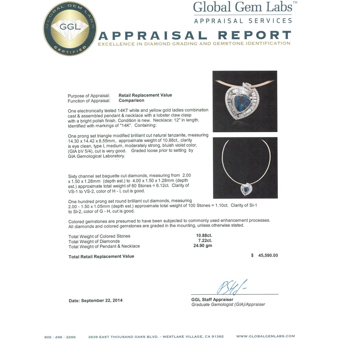 One electronically tested 14KT white and yellow gold ladies combination cast & assembled pendant & necklace with a lobster claw clasp with a bright polish finish. Necklace: 12" in length. Identified with markings of "14K". Condition is new. Containing: One prong set triangle modified brilliant cut natural tanzanite, measuring 14.30 x 14.42 x 8.55mm, approximate weight of 10.88ct., clarity is eye clean, type I, medium, moderately strong, bluish violet color, (GIA bV 5/4), cut is very good. Graded loose prior to setting by GIA Gemological Laboratory. GIA Report: #1166453352. Sixty channel set baguette cut diamonds, measuring from 2.00 x 1.50 x 1.28mm (depth est.) to 4.00 x 1.50 x 1.28mm (depth est.) approximate total weight of 60 Stones = 6.12ct. Clarity: VS-1 to VS-2. Color: H - I, Cut is Good. One Hundred prong set round brilliant cut diamonds, measuring 2.00 - 1.50 x 1.05mm (depth est.) approximate total weight of 100 Stones = 1.10ct. Clarity: SI-1 to SI-2. Color: G - H, Cut is Good. Colored gemstones are presumed to have been subjected to commonly used enhancement processes. All diamonds and colored gemstones are graded in the mounting, unless otherwise stated. Total Weight of Colored Stones 10.88ct. Total Weight of Diamonds 7.22ct. Total Weight of Pendant & Necklace 24.90 grams. GGL Appraised at $45,590.00.