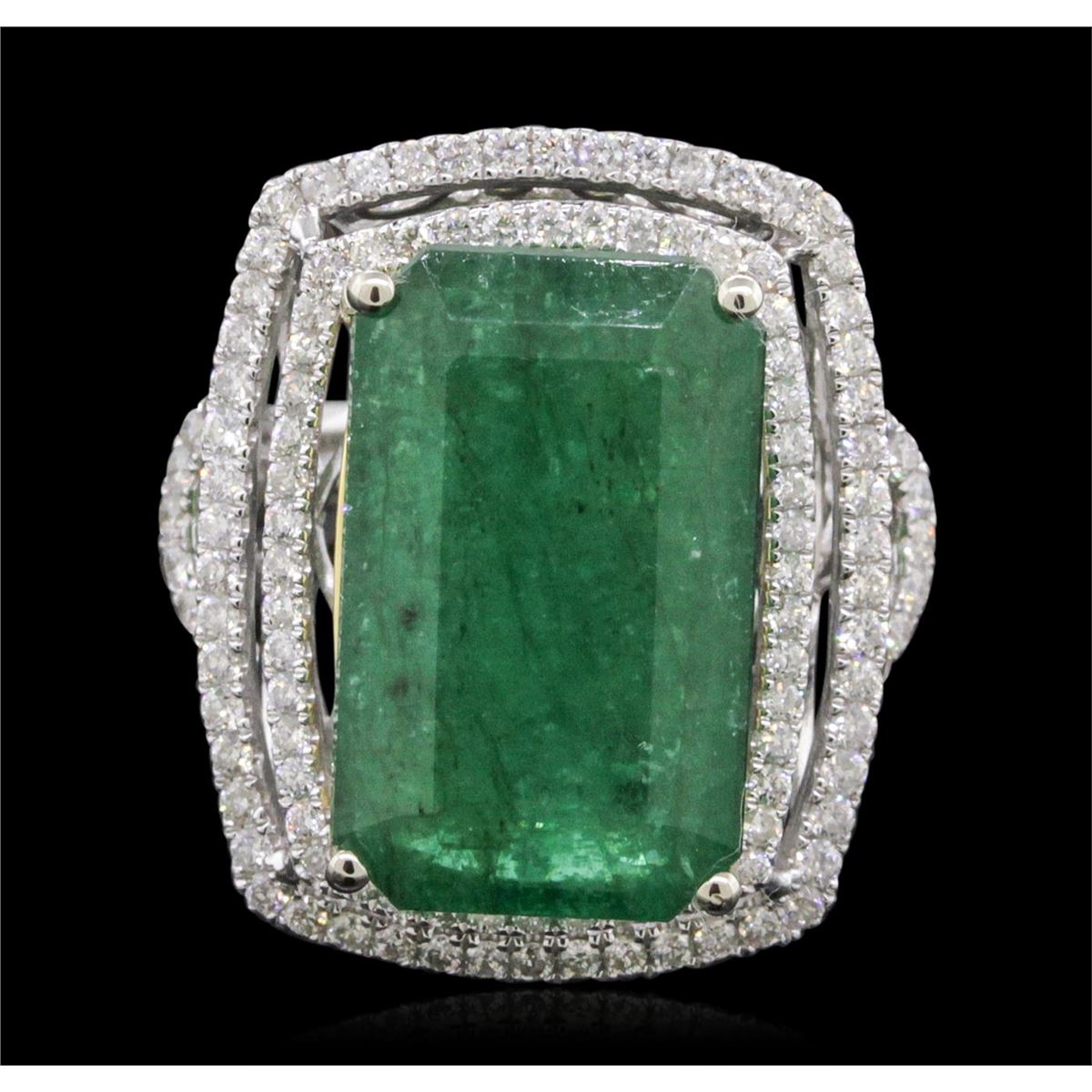 One electronically tested 14KT white and yellow gold ladies combination cast & assembled emerald and diamond ring with a split shank with a bright polish finish. Identified with markings of "14K". Condition is new. Containing: One prong set emerald standard step cut natural emerald, measuring 18.91 x 11.57 x 7.71mm, approximate weight of 12.39ct., clarity is heavily included, type III, medium, moderately strong, green color, (GIA G 5/4), cut is good. One Hundred Thirty-Eight prong set round brilliant cut diamonds, measuring 1.30 - 1.30 x 0.78mm (depth est.) approximate total weight of 138 Stones = 1.10ct. Clarity: SI-2 to I-2. Color: H - I, Cut is Good. Colored gemstones are presumed to have been subjected to commonly used enhancement processes. All diamonds and colored gemstones are graded in the mounting, unless otherwise stated. Total Weight of Colored Stones 12.39ct. Total Weight of Diamonds 1.10ct. Total Weight of Ring 9.30 grams. GGL Appraised at $9,275.00.