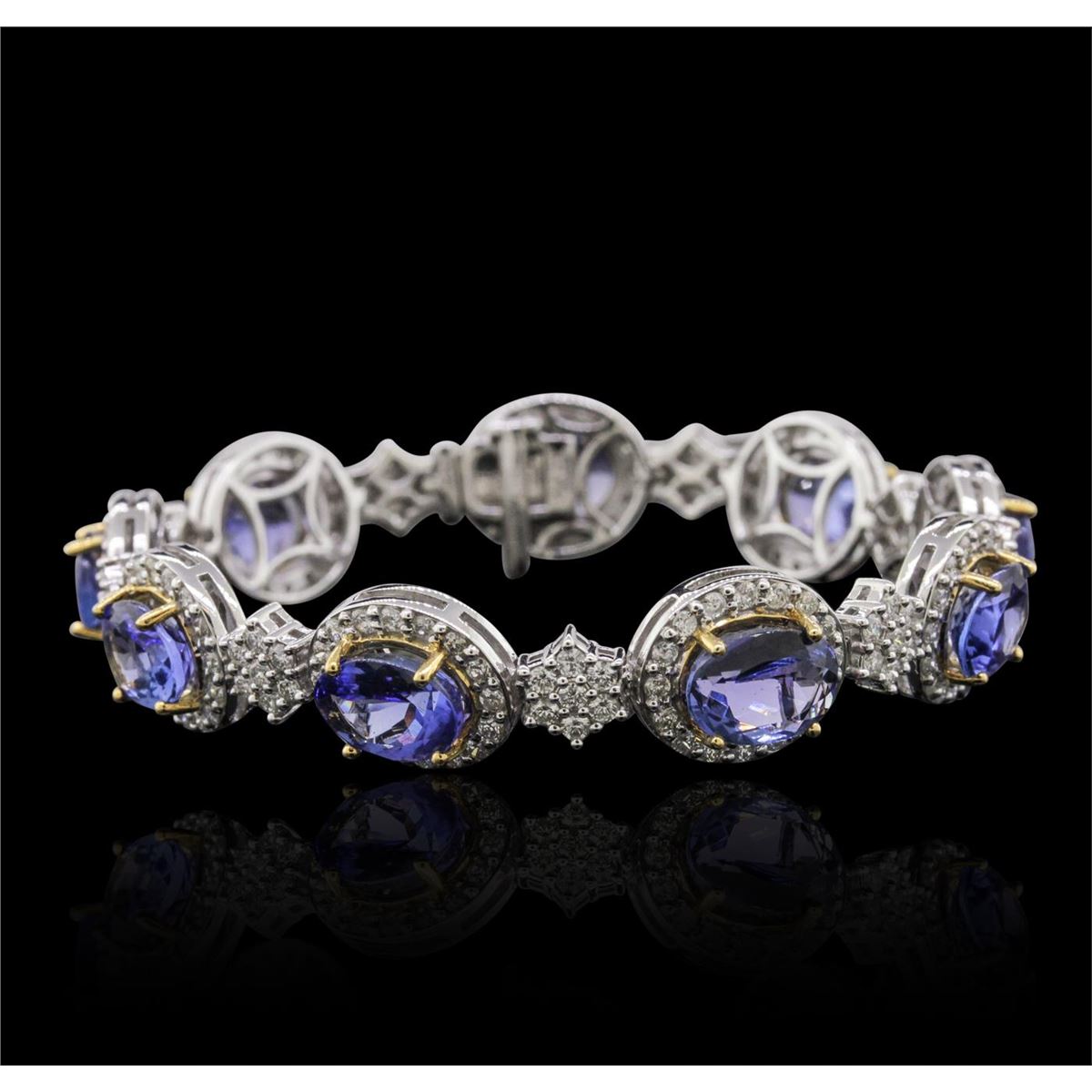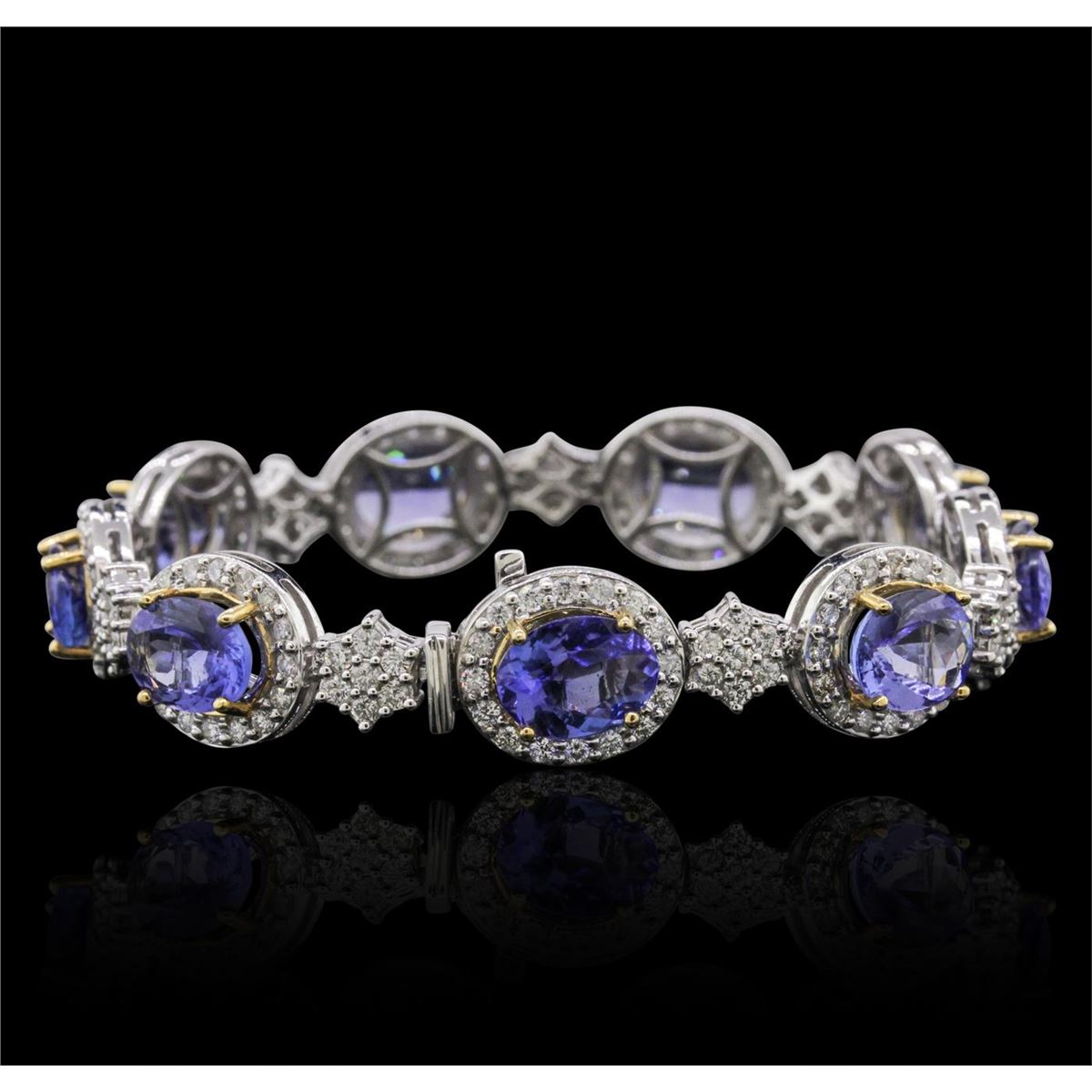 One electronically tested 14KT white and yellow gold ladies combination cast & assembled tanzanite and diamond bracelet with a hidden box clasp with safety closer with a bright polish finish. Measurements: 7.25" in length. Identified with markings of "14K". Condition is new. Containing: Nine prong set oval modified brilliant cut natural tanzanites, measuring 9.56 x 7.37 x 3.63mm, approximate total weight of 15.66ct., clarity is eye clean, type I, medium, moderately strong, bluish violet color, (GIA bV 5/4), cut is very good. Two Hundred Seven prong set round brilliant cut diamonds, measuring 1.60 - 1.30 x 0.87mm (depth est.) approximate total weight of 207 Stones = 2.30ct. Clarity: SI-2 to I-2. Color: H - I, Cut is Good. Colored gemstones are presumed to have been subjected to commonly used enhancement processes. All diamonds and colored gemstones are graded in the mounting, unless otherwise stated. Total Weight of Colored Stones 15.66ct. Total Weight of Diamonds 2.30ct. Total Weight of Bracelet 27.90 grams. GGL Appraised at $36,110.00.
