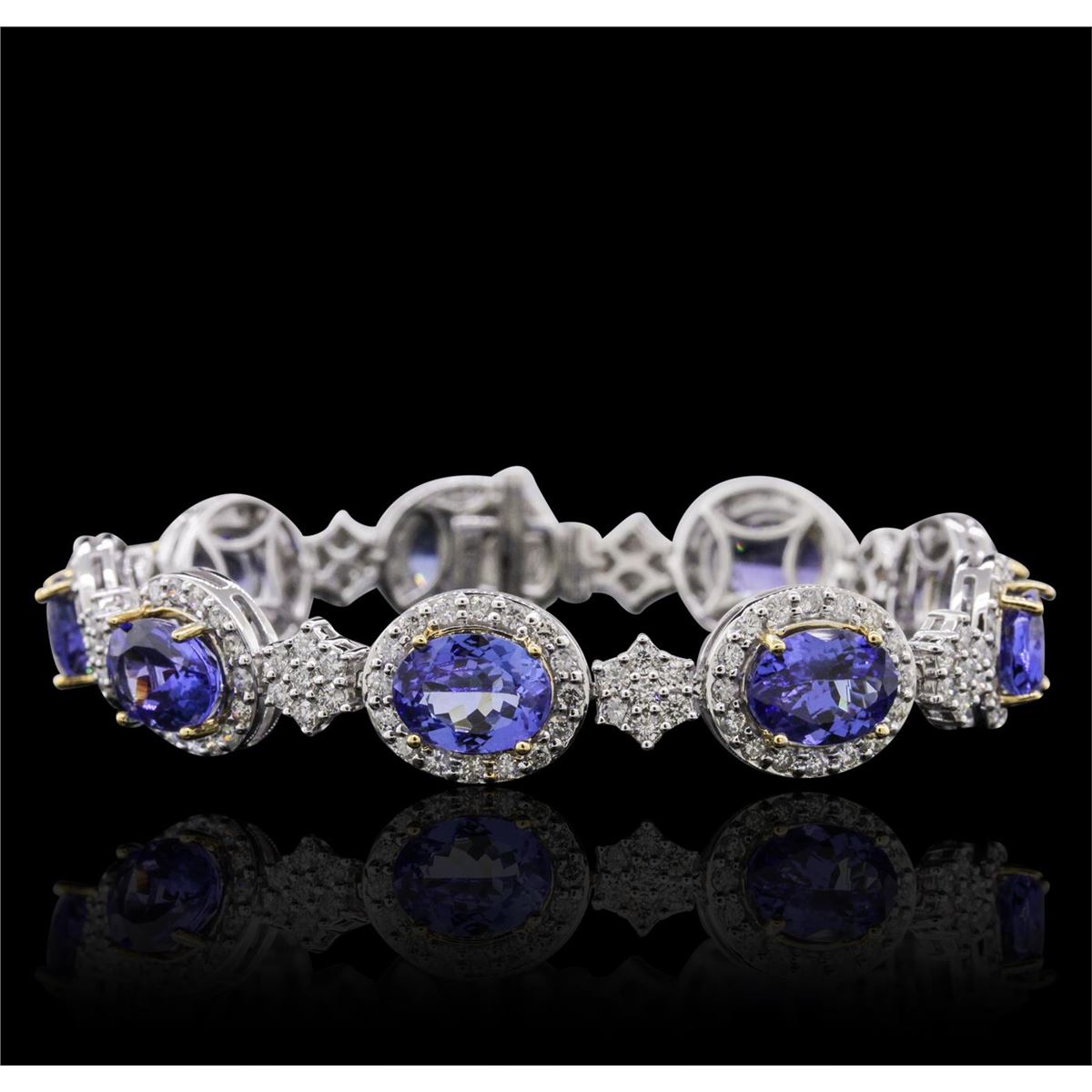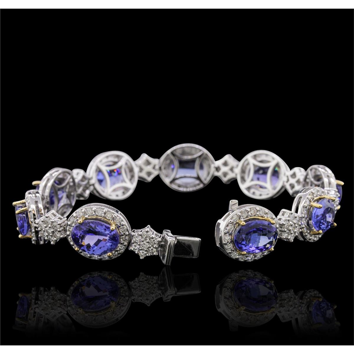 One electronically tested 14KT white and yellow gold ladies combination cast & assembled tanzanite and diamond bracelet with a hidden box clasp with safety closer with a bright polish finish. Measurements: 7.25" in length. Identified with markings of "14K". Condition is new. Containing: Nine prong set oval modified brilliant cut natural tanzanites, measuring 9.68 x 6.96 x 4.51mm, approximate total weight of 18.81ct., clarity is eye clean, type I, medium, moderately strong, bluish violet color, (GIA bV 5/4), cut is very good. Two Hundred Seven prong set round brilliant cut diamonds, measuring 1.60 - 1.30 x 0.87mm (depth est.) approximate total weight of 207 Stones = 2.30ct. Clarity: SI-2 to I-2. Color: H - I, Cut is Good. Colored gemstones are presumed to have been subjected to commonly used enhancement processes. All diamonds and colored gemstones are graded in the mounting, unless otherwise stated. Total Weight of Colored Stones 18.81ct. Total Weight of Diamonds 2.30ct. Total Weight of Bracelet 27.80 grams. GGL Appraised at $40,125.00.