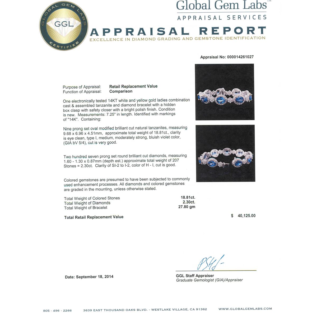 One electronically tested 14KT white and yellow gold ladies combination cast & assembled tanzanite and diamond bracelet with a hidden box clasp with safety closer with a bright polish finish. Measurements: 7.25" in length. Identified with markings of "14K". Condition is new. Containing: Nine prong set oval modified brilliant cut natural tanzanites, measuring 9.68 x 6.96 x 4.51mm, approximate total weight of 18.81ct., clarity is eye clean, type I, medium, moderately strong, bluish violet color, (GIA bV 5/4), cut is very good. Two Hundred Seven prong set round brilliant cut diamonds, measuring 1.60 - 1.30 x 0.87mm (depth est.) approximate total weight of 207 Stones = 2.30ct. Clarity: SI-2 to I-2. Color: H - I, Cut is Good. Colored gemstones are presumed to have been subjected to commonly used enhancement processes. All diamonds and colored gemstones are graded in the mounting, unless otherwise stated. Total Weight of Colored Stones 18.81ct. Total Weight of Diamonds 2.30ct. Total Weight of Bracelet 27.80 grams. GGL Appraised at $40,125.00.