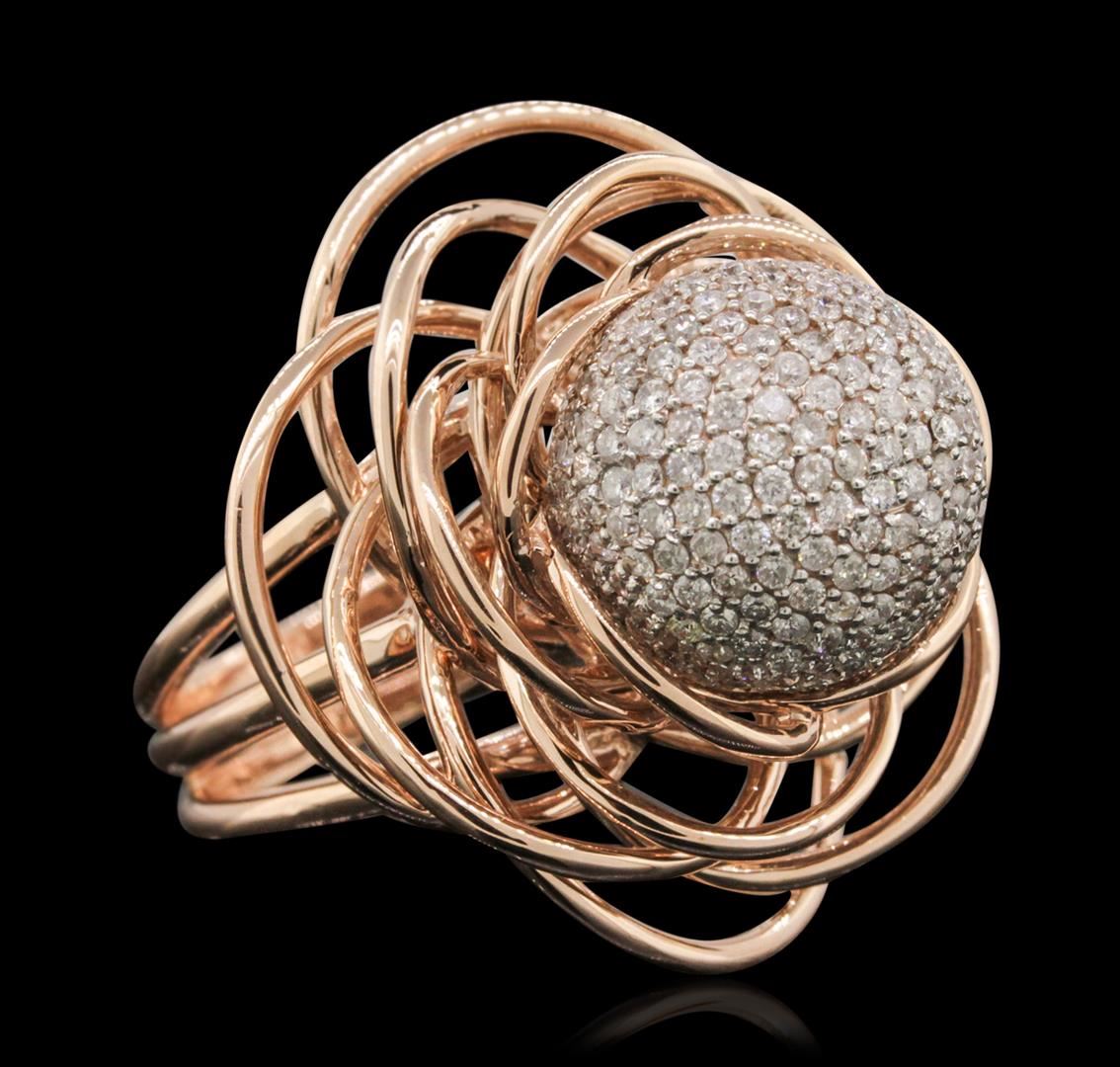 One electronically tested 14KT rose and white gold ladies cast & assembled diamond ring with a bright polish finish. Condition is new, good workmanship. The ring features a white gold diamond encrusted sphere set within intertwining rose gold ribbons, completed by a five millimeter wide band. Identified with markings of "14K". Containing: Two Hundred Eighty pav, set round brilliant cut diamonds, measuring 1.30 - 1.20 x 0.75mm (depth est.) approximate. Total Weight of 280 Stones = 2.10 ct. Graded in the setting. Clarity: I-1 to I-2. Color: G - I. Total Weight of Diamonds 2.10 ct. Total Weight of Ring 17.96gm. AIG Appraised.