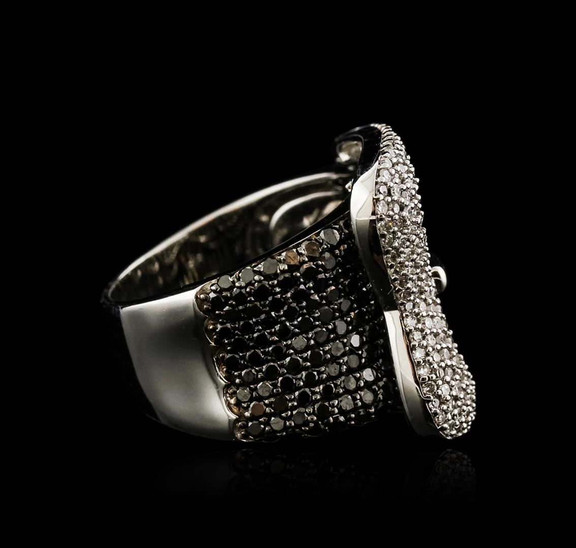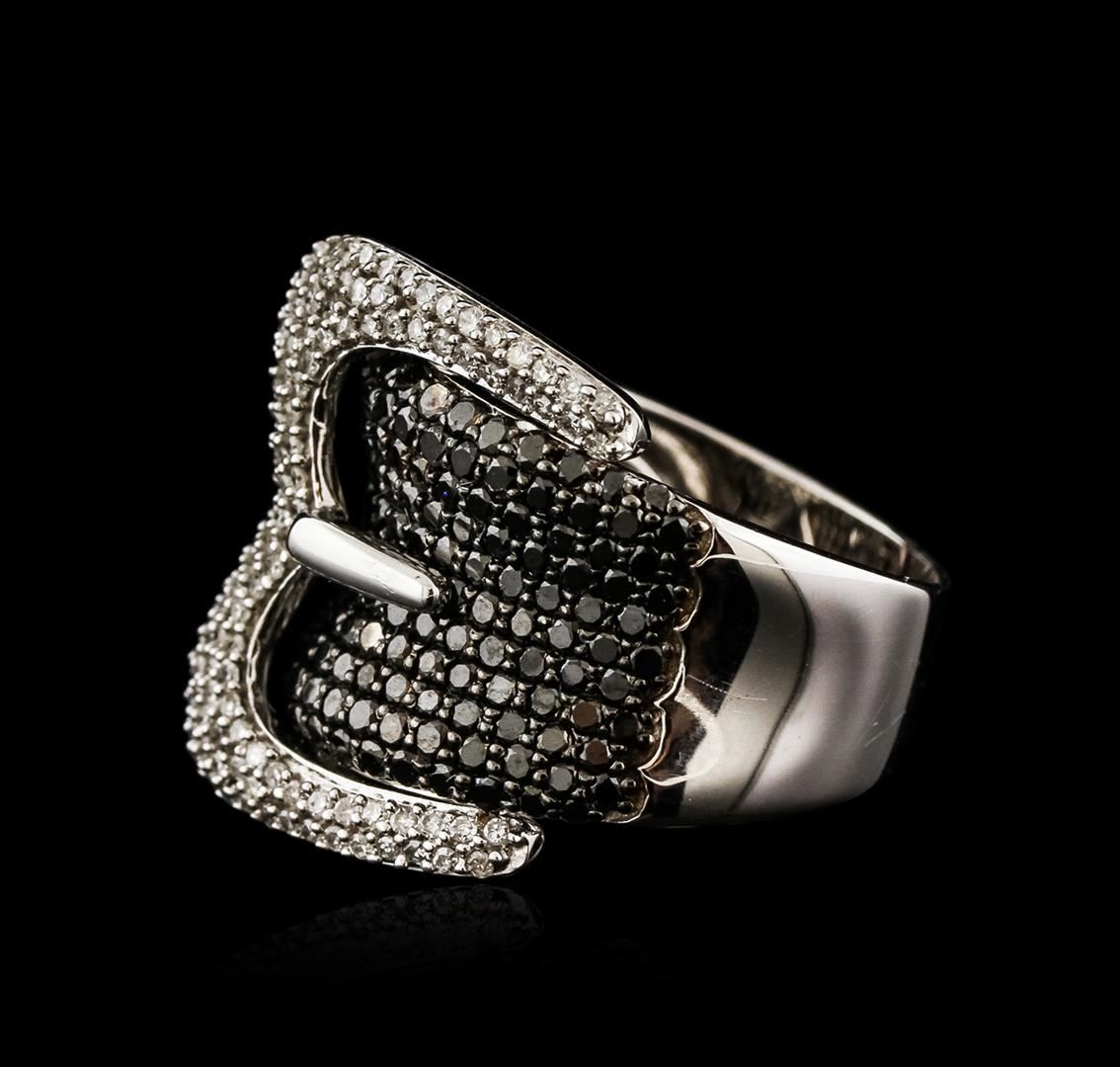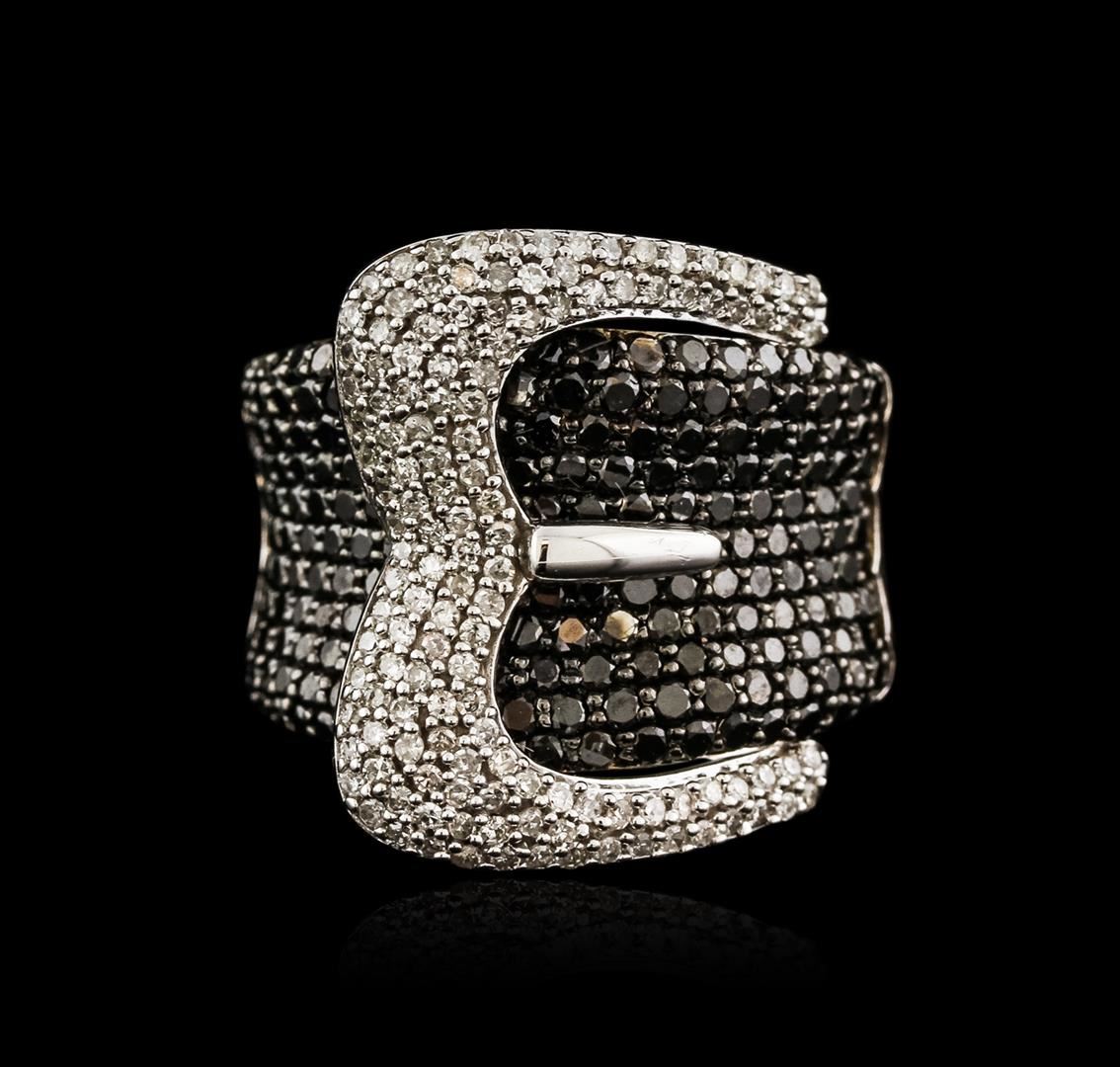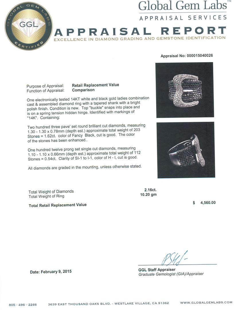 One electronically tested 14KT white and black gold ladies combination cast & assembled diamond ring with a tapered shank with a bright polish finish. Top "buckle" snaps into place and is on a spring tension hidden hinge. Identified with markings of "14K". Condition is new. Containing: Two Hundred Three pave' set round brilliant cut diamonds, measuring 1.30 - 1.30 x 0.78mm (depth est.) approximate total weight of 203 Stones = 1.62ct. Color is Fancy Black. Cut is Good. The color of the stones has been enhanced. One Hundred Twelve prong set single cut diamonds, measuring 1.10 - 1.10 x 0.66mm (depth est.) approximate total weight of 112 Stones = 0.54ct. Clarity: SI-1 to I-1. Color: H - I, Cut is Good. All diamonds are graded in the mounting, unless otherwise stated. Total Weight of Diamonds 2.16ct. Total Weight of Ring 10.20 grams. GGL Appraised at $4,560.00.
