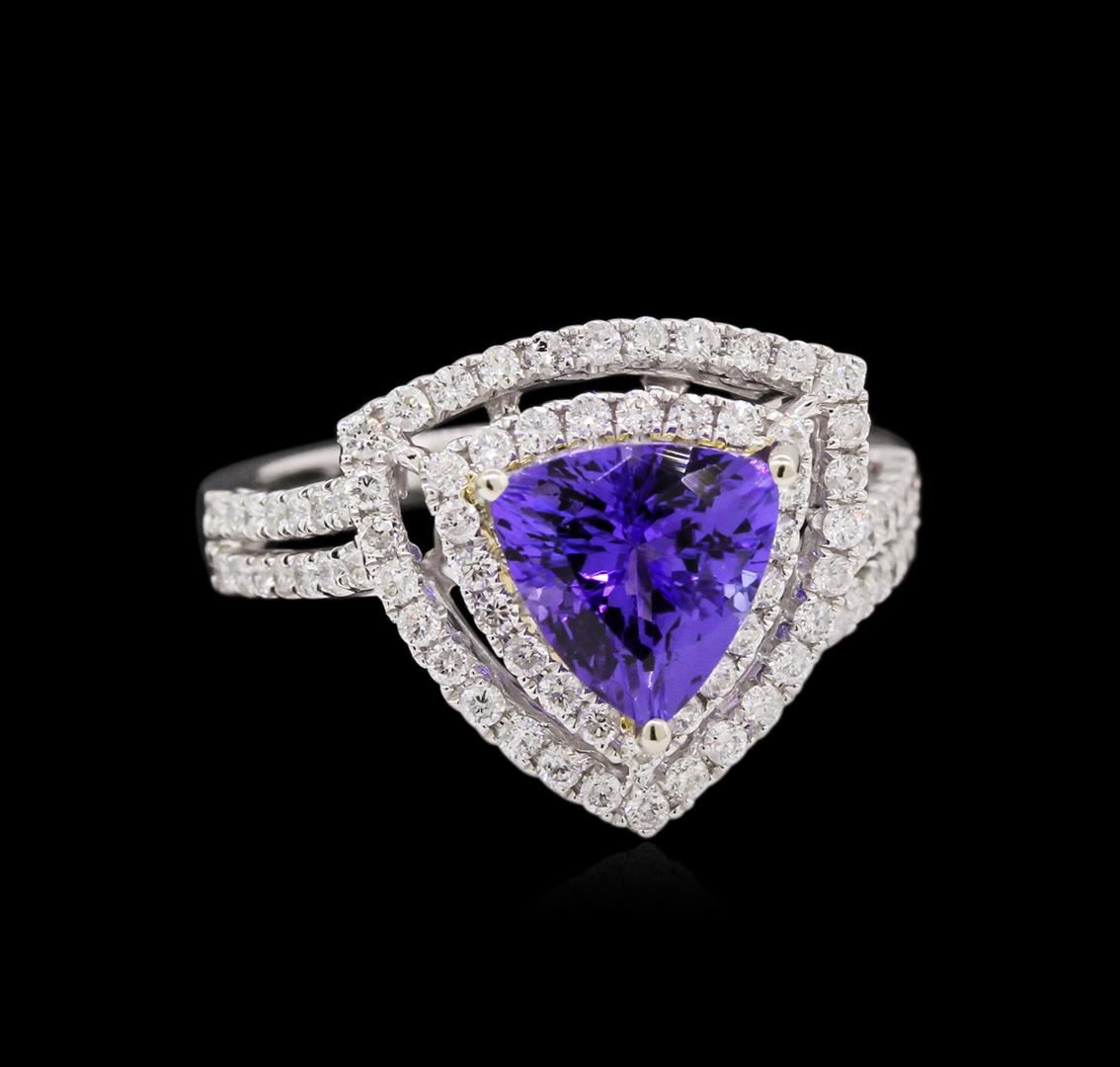 One electronically tested 14KT white and yellow gold Ladies combination cast & assembled ring with a bright polish finish. Condition is new. Identified with markings of "14K". Containing: Eighty-One bead set round brilliant cut diamonds, measuring 1.30 - 1.30 x 0.78mm (depth est.) approximate. Total Weight of 81 Stones = 0.83ct. Clarity: I-1 to I-2. Color: I - J, Cut is Good. One prong set triangle modified mixed cut natural tanzanite, measuring 8.00 x 8.00 x 5.20mm, approximate weight of 2.25ct., clarity is eye clean, type I, medium, moderately strong, bluish violet color, (GIA bV 5/4), cut is very good. Colored gemstones are presumed to have been subjected to commonly used color/clarity enhancement processes. Total Weight of Colored Stones 2.25ct. Total Weight of Diamonds 0.83ct. Total Weight of Ring 4.40 grams. GGL Appraised at $5,365.00.