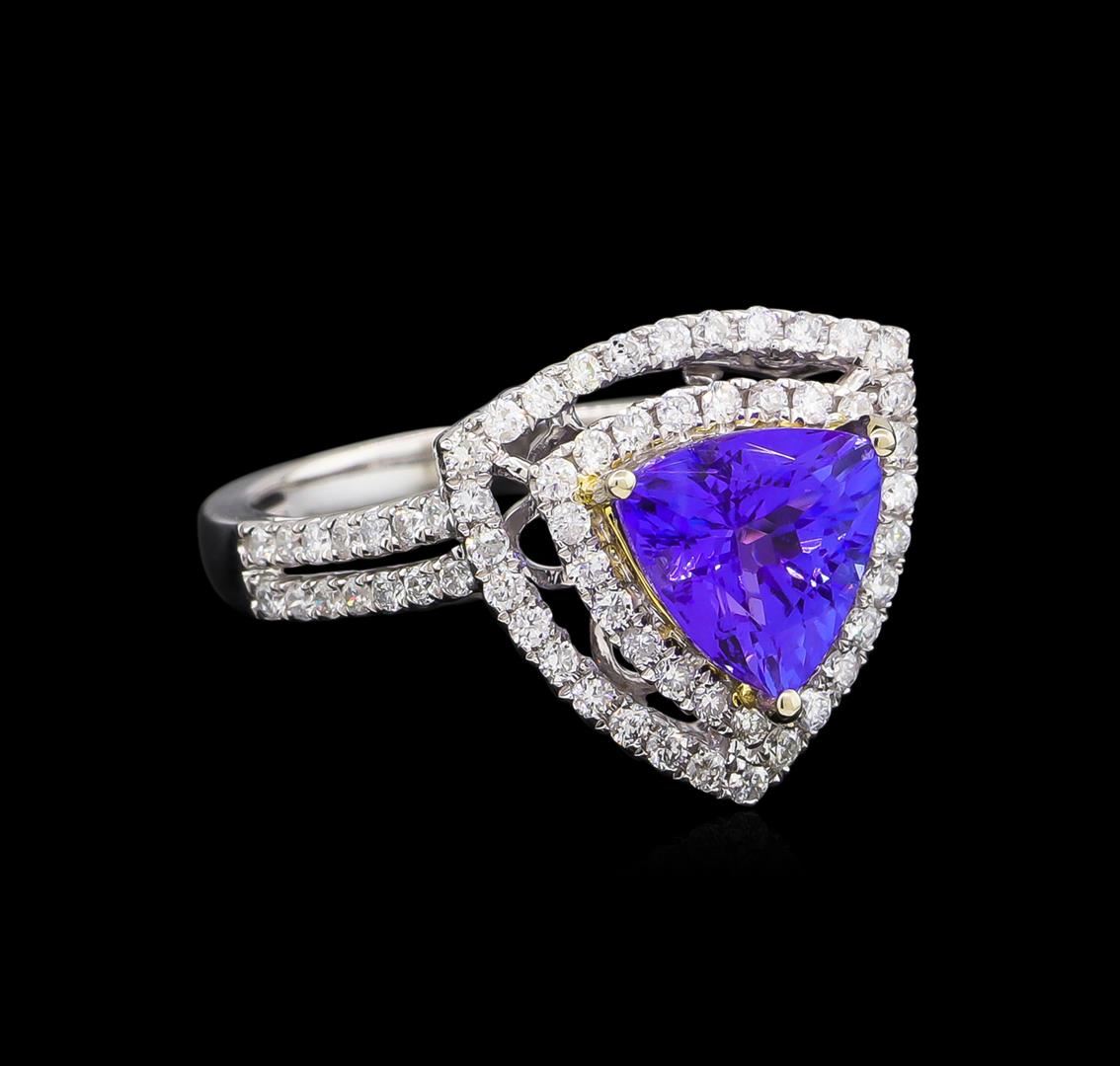 One electronically tested 14KT white and yellow gold Ladies combination cast & assembled ring with a bright polish finish. Condition is new. Identified with markings of "14K". Containing: Eighty-One bead set round brilliant cut diamonds, measuring 1.30 - 1.30 x 0.78mm (depth est.) approximate. Total Weight of 81 Stones = 0.83ct. Clarity: I-1 to I-2. Color: I - J, Cut is Good. One prong set triangle modified mixed cut natural tanzanite, measuring 8.00 x 8.00 x 5.20mm, approximate weight of 2.25ct., clarity is eye clean, type I, medium, moderately strong, bluish violet color, (GIA bV 5/4), cut is very good. Colored gemstones are presumed to have been subjected to commonly used color/clarity enhancement processes. Total Weight of Colored Stones 2.25ct. Total Weight of Diamonds 0.83ct. Total Weight of Ring 4.40 grams. GGL Appraised at $5,365.00.