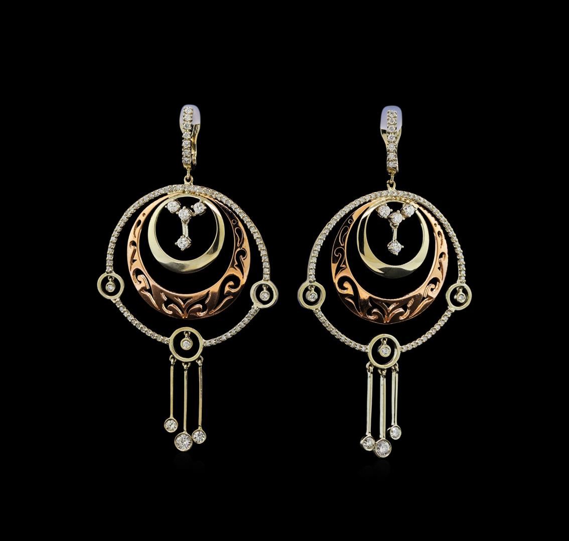 One pair electronically tested 14KT white and rose gold ladies cast diamond earrings with Omega clip backs with a bright polish finish. Identified with markings of "585". Condition is new. Containing: One Hundred Seventy prong set round brilliant cut diamonds, measuring 2.50 - 1.30 x 1.14mm (depth est.) approximate total weight of 170 Stones = 2.28ct. Clarity: SI-1 to I-1. Color: G - I, Cut is Good. All diamonds are graded in the mounting, unless otherwise stated. Total Weight of Diamonds 2.28ct. Total Weight of Earrings 19.40 grams. GGL Appraised at $4,535.00.