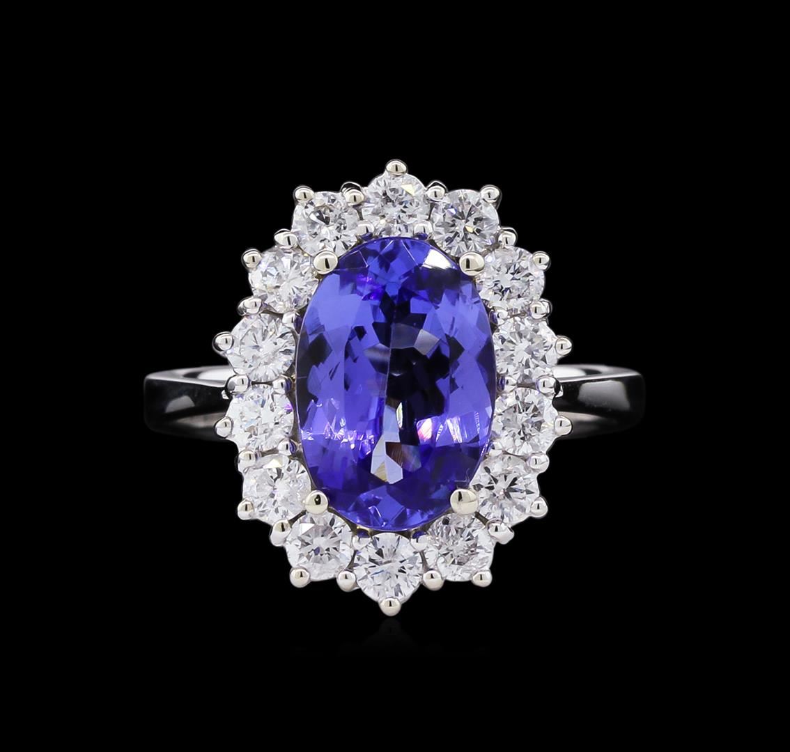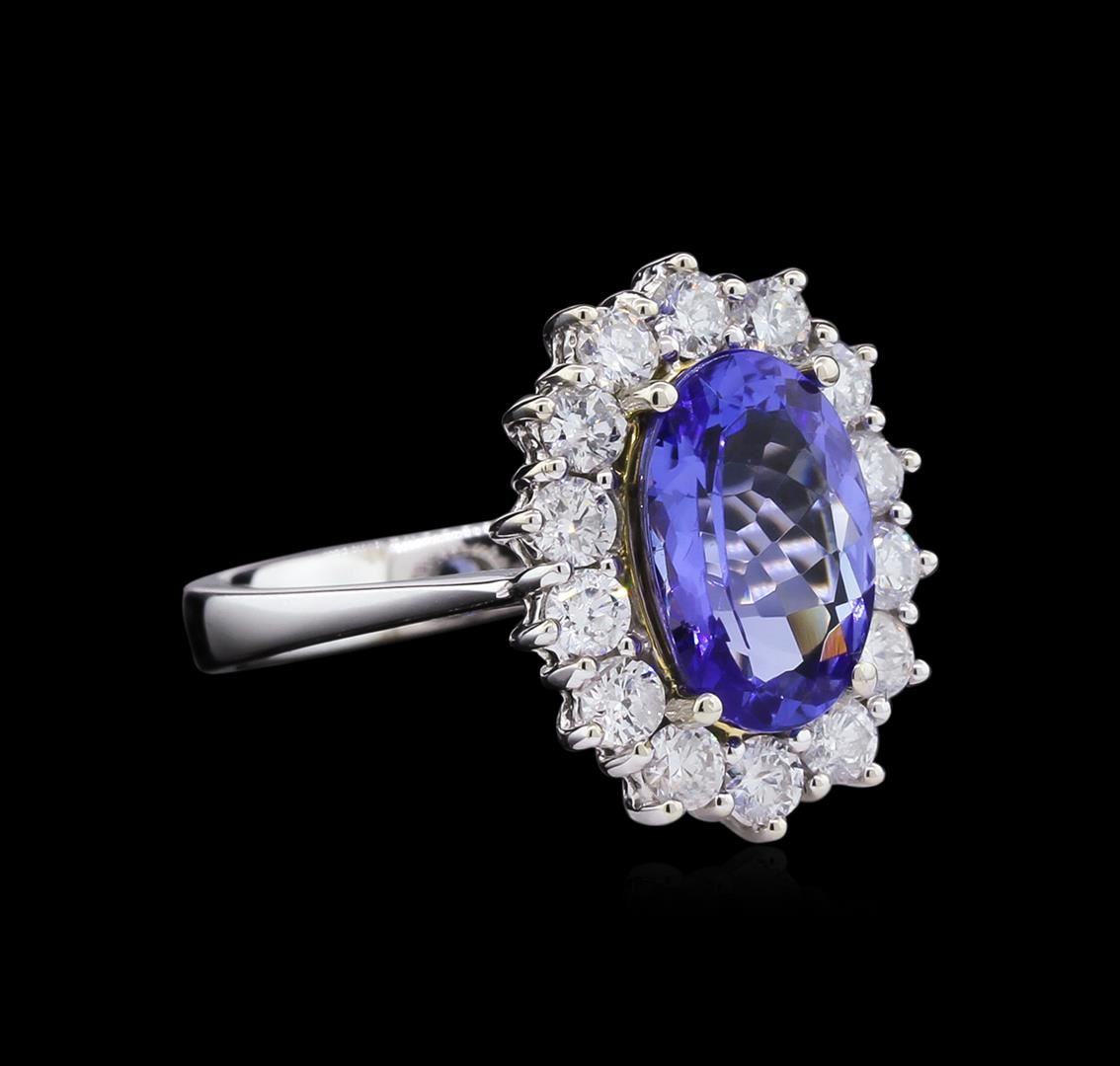 One electronically tested 14KT white and yellow gold Ladies combination cast & assembled ring with a bright polish finish. Condition is new. Identified with markings of "14K". Containing: One prong set oval modified brilliant cut natural tanzanite, measuring 11.00 x 7.00 x 4.39mm, approximate weight of 2.38ct., clarity is eye clean, type I, medium, moderately strong, bluish violet color, (GIA bV 5/4), cut is good. Colored gemstones are presumed to have been subjected to commonly used color/clarity enhancement processes. Fourteen prong set round brilliant cut diamonds, measuring 2.50 - 2.50 x 1.50mm (depth est.) approximate. Total Weight of 14 Stones = 0.80ct. Clarity: I-1. Color: I - J, Cut is Good. Total Weight of Colored Stones 2.38ct. Total Weight of Diamonds 0.80ct. Total Weight of Ring 5.50 grams. GGL Appraised at $6,980.00.