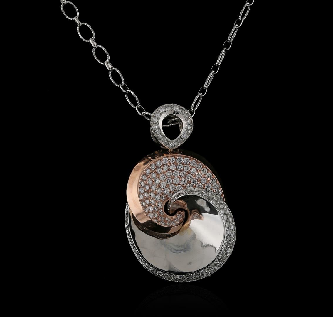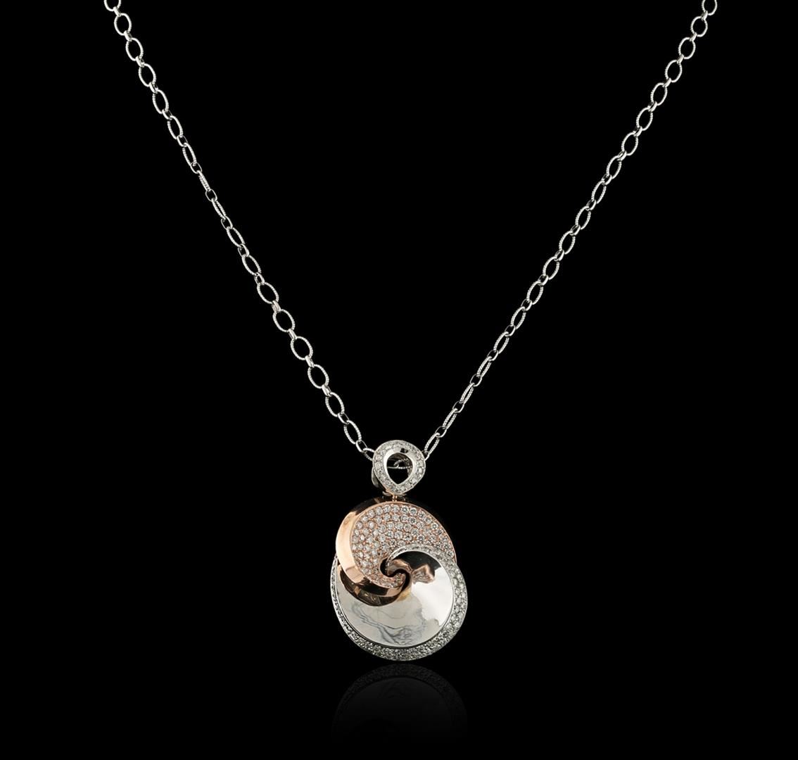 One electronically tested 14KT white and rose gold ladies cast diamond pendant & chain 16.0" long, with a lobster claw clasp with a bright polish finish. Identified with markings of "14K". Condition is new. Containing: One Hundred Seventy-Two prong set round brilliant cut diamonds, measuring 1.50 - 1.50 x 0.90mm (depth est.) approximate total weight of 172 Stones = 2.38ct. Clarity: VS-2 to SI-1. Color: G - H, Cut is Good. All diamonds are graded in the mounting, unless otherwise stated. Total Weight of Diamonds 2.38ct. Total Weight of Pendant & Chain 14.30 grams. GGL Appraised at $7,385.00.