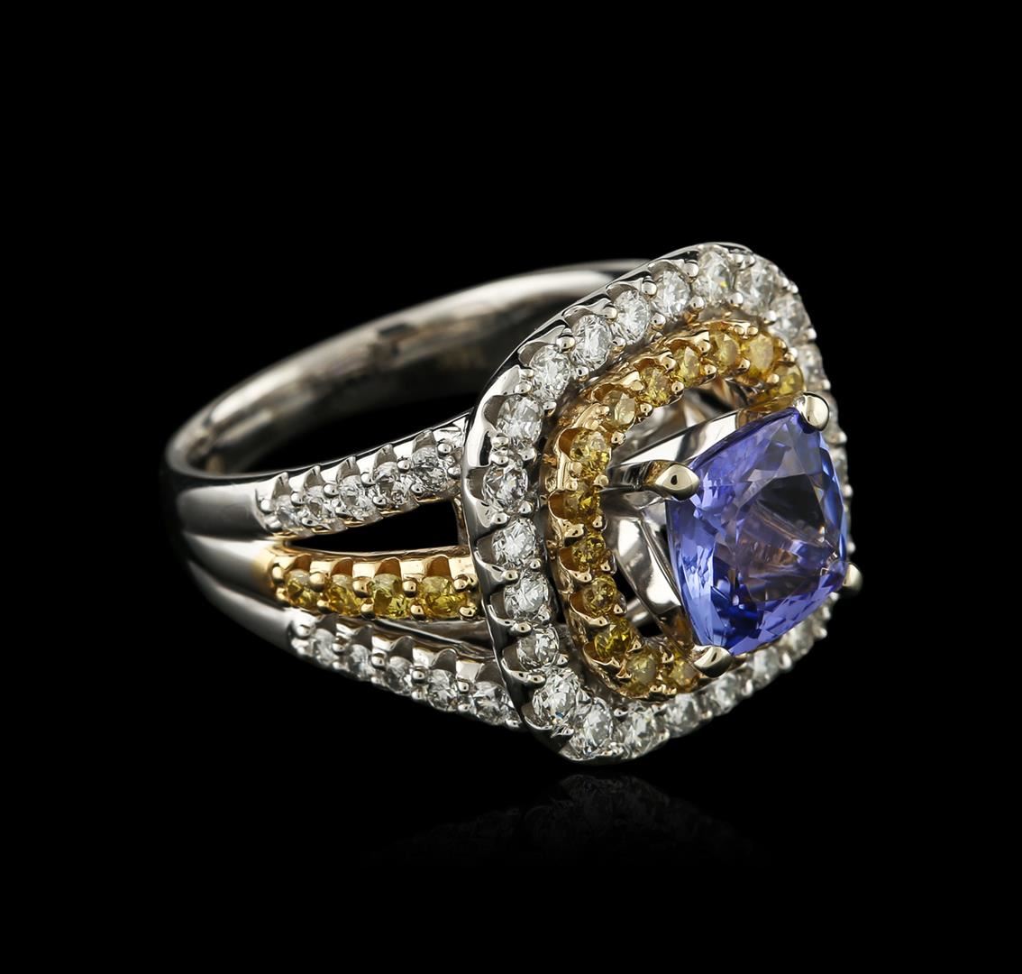 One electronically tested 14KT white and yellow gold ladies cast tanzanite and diamond ring with a bright polish finish. Identified with markings of "14K". Condition is new. Containing: One prong set square cushion modified brilliant cut natural tanzanite, measuring 7.80 x 7.80 x 5.08mm, approximate weight of 2.43ct., clarity is eye clean, type I, medium light, very slightly grayish, violet color, (GIA V 4/3), cut is good. Forty-Four prong set round brilliant cut diamonds, measuring 1.50 - 1.50 x 0.90mm (depth est.) approximate total weight of 44 Stones = 0.54ct. Clarity: SI-1 to SI-2. Color: H - I, Cut is Good. Twenty-Eight prong set round brilliant cut diamonds, measuring 1.70 - 1.70 x 1.02mm (depth est.) approximate total weight of 28 Stones = 0.50ct. Clarity: SI-1 to I-1, Cut is Good. Color of the stones has been treated. Diamonds and colored gemstones are graded in the mounting, unless otherwise stated. Colored gemstones are presumed to have been subjected to commonly used enhancement processes. Total Weight of Colored Stones 2.43ct. Total Weight of Diamonds 1.04ct. Total Weight of Ring 10.80 grams. GGL Appraised at $6,060.00.
