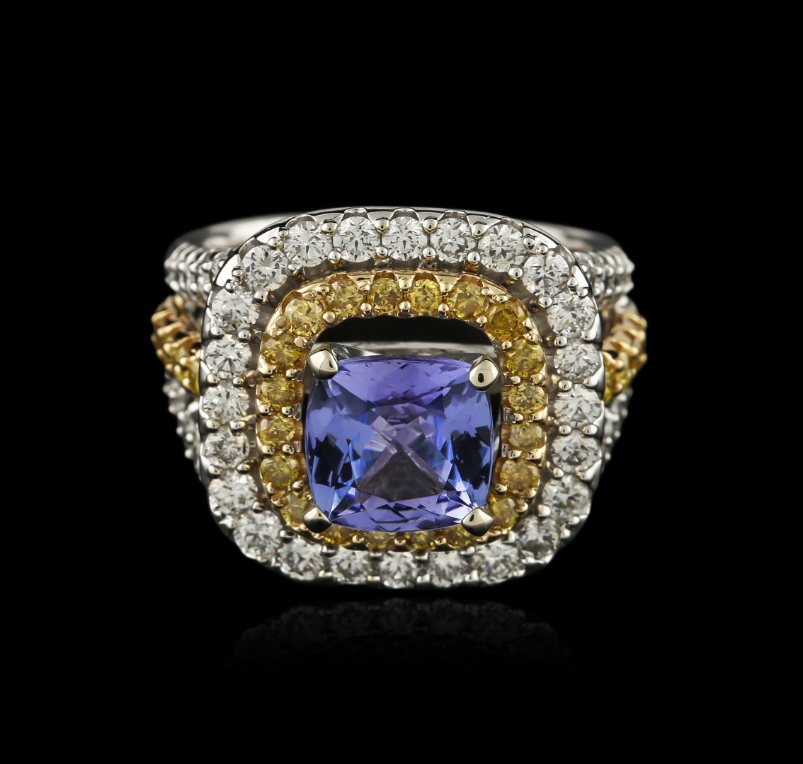 One electronically tested 14KT white and yellow gold ladies cast tanzanite and diamond ring with a bright polish finish. Identified with markings of "14K". Condition is new. Containing: One prong set square cushion modified brilliant cut natural tanzanite, measuring 7.80 x 7.80 x 5.08mm, approximate weight of 2.43ct., clarity is eye clean, type I, medium light, very slightly grayish, violet color, (GIA V 4/3), cut is good. Forty-Four prong set round brilliant cut diamonds, measuring 1.50 - 1.50 x 0.90mm (depth est.) approximate total weight of 44 Stones = 0.54ct. Clarity: SI-1 to SI-2. Color: H - I, Cut is Good. Twenty-Eight prong set round brilliant cut diamonds, measuring 1.70 - 1.70 x 1.02mm (depth est.) approximate total weight of 28 Stones = 0.50ct. Clarity: SI-1 to I-1, Cut is Good. Color of the stones has been treated. Diamonds and colored gemstones are graded in the mounting, unless otherwise stated. Colored gemstones are presumed to have been subjected to commonly used enhancement processes. Total Weight of Colored Stones 2.43ct. Total Weight of Diamonds 1.04ct. Total Weight of Ring 10.80 grams. GGL Appraised at $6,060.00.