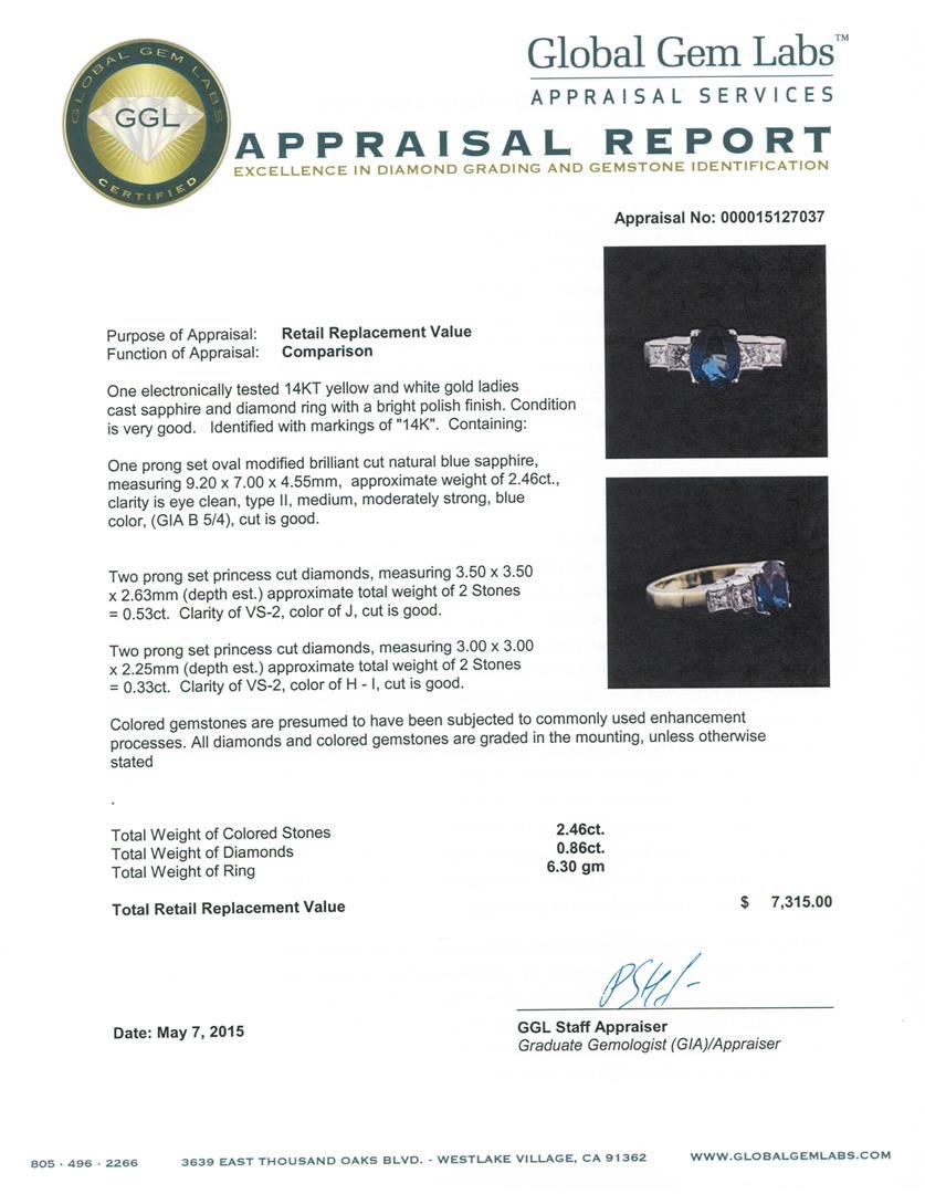 One electronically tested 14KT yellow and white gold ladies cast sapphire and diamond ring with a bright polish finish. Identified with markings of "14K". Condition is very good. Containing: One prong set oval modified brilliant cut natural blue sapphire, measuring 9.20 x 7.00 x 4.55mm, approximate weight of 2.46ct., clarity is eye clean, type II, medium, moderately strong, blue color, (GIA B 5/4), cut is good. Two prong set princess cut diamonds, measuring 3.50 x 3.50 x 2.63mm (depth est.) approximate total weight of 2 Stones = 0.53ct. Clarity: VS-2. Color: J, Cut is Good. Two prong set princess cut diamonds, measuring 3.00 x 3.00 x 2.25mm (depth est.) approximate total weight of 2 Stones = 0.33ct. Clarity: VS-2. Color: H - I, Cut is Good. Colored gemstones are presumed to have been subjected to commonly used enhancement processes. All diamonds and colored gemstones are graded in the mounting, unless otherwise stated. Total Weight of Colored Stones 2.46ct. Total Weight of Diamonds 0.86ct. Total Weight of Ring 6.30 grams. GGL Appraised at $7,315.00.
