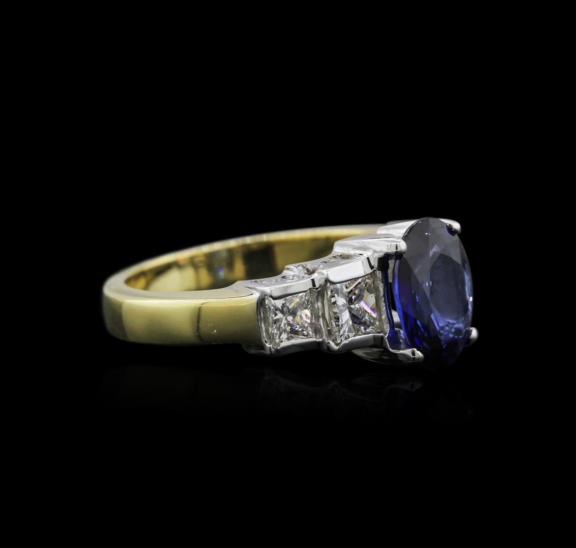 One electronically tested 14KT yellow and white gold ladies cast sapphire and diamond ring with a bright polish finish. Identified with markings of "14K". Condition is very good. Containing: One prong set oval modified brilliant cut natural blue sapphire, measuring 9.20 x 7.00 x 4.55mm, approximate weight of 2.46ct., clarity is eye clean, type II, medium, moderately strong, blue color, (GIA B 5/4), cut is good. Two prong set princess cut diamonds, measuring 3.50 x 3.50 x 2.63mm (depth est.) approximate total weight of 2 Stones = 0.53ct. Clarity: VS-2. Color: J, Cut is Good. Two prong set princess cut diamonds, measuring 3.00 x 3.00 x 2.25mm (depth est.) approximate total weight of 2 Stones = 0.33ct. Clarity: VS-2. Color: H - I, Cut is Good. Colored gemstones are presumed to have been subjected to commonly used enhancement processes. All diamonds and colored gemstones are graded in the mounting, unless otherwise stated. Total Weight of Colored Stones 2.46ct. Total Weight of Diamonds 0.86ct. Total Weight of Ring 6.30 grams. GGL Appraised at $7,315.00.