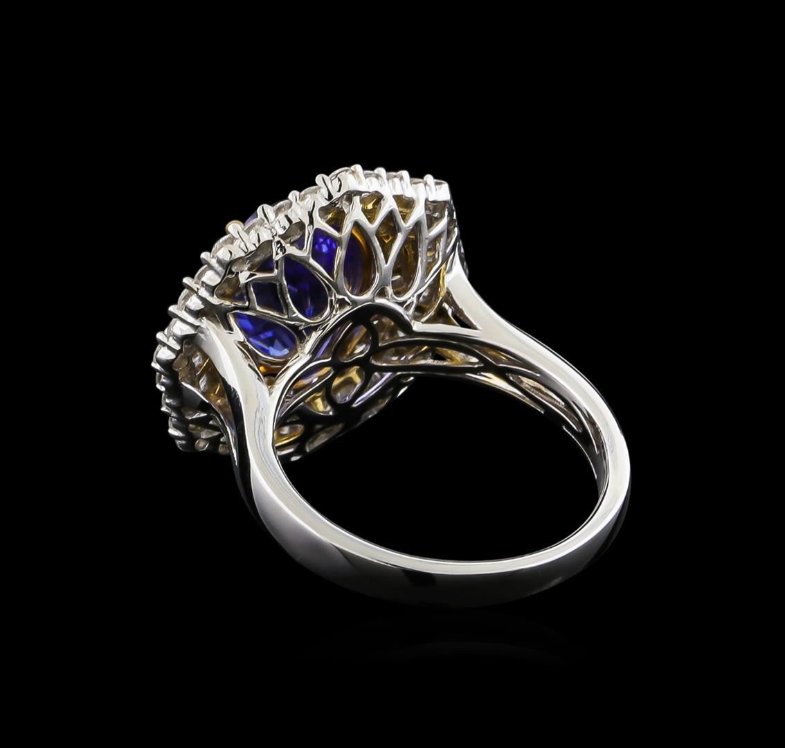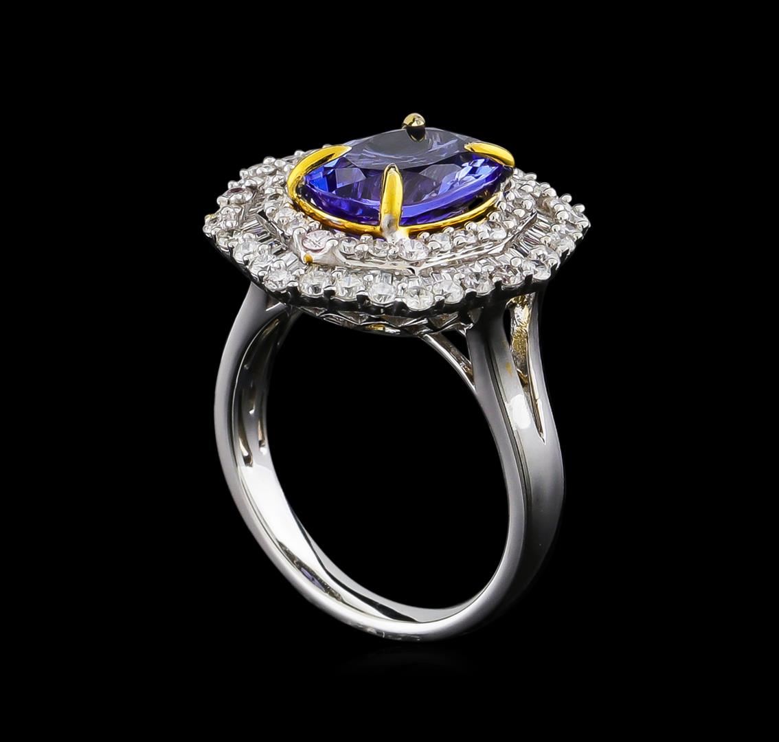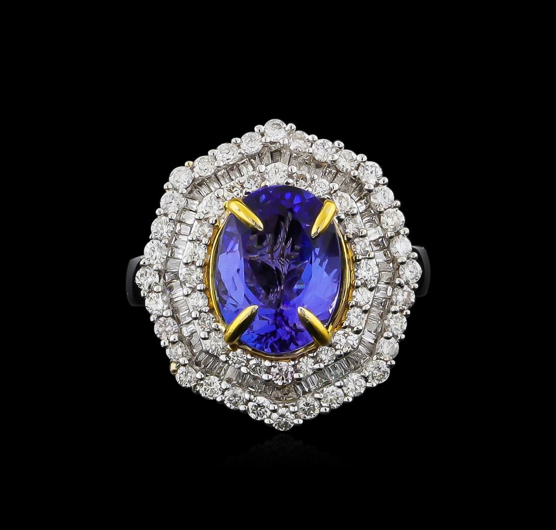 One electronically tested 14KT white and yellow gold ladies combination cast & assembled tanzanite and diamond ring with a split shank with a bright polish finish. Identified with markings of "14K". Condition is new. Containing: One prong set oval modified brilliant cut natural tanzanite, measuring 11.36 x 8.52 x 3.97mm, approximate weight of 2.63ct., clarity is eye clean, type I, medium, very slightly grayish, violet color, (GIA V 5/3), cut is good. Fifty-Six prong set round brilliant cut diamonds, measuring 1.70 - 1.30 x 0.90mm (depth est.) approximate total weight of 56 Stones = 0.69ct. Clarity: SI-2 to I-2. Color: I - J, Cut is Good. Fifty-Six channel set baguette cut diamonds, measuring 1.30 x 1.10 x 0.94mm (depth est.) approximate total weight of 56 Stones = 0.69ct. Clarity: SI-1. Color: H - I, Cut is Good. Colored gemstones are presumed to have been subjected to commonly used enhancement processes. All diamonds and colored gemstones are graded in the mounting, unless otherwise stated total weight of Colored Stones 2.63ct. Total Weight of Diamonds 1.38ct. Total Weight of Ring 6.40 grams. GGL Appraised at $9,200.00.