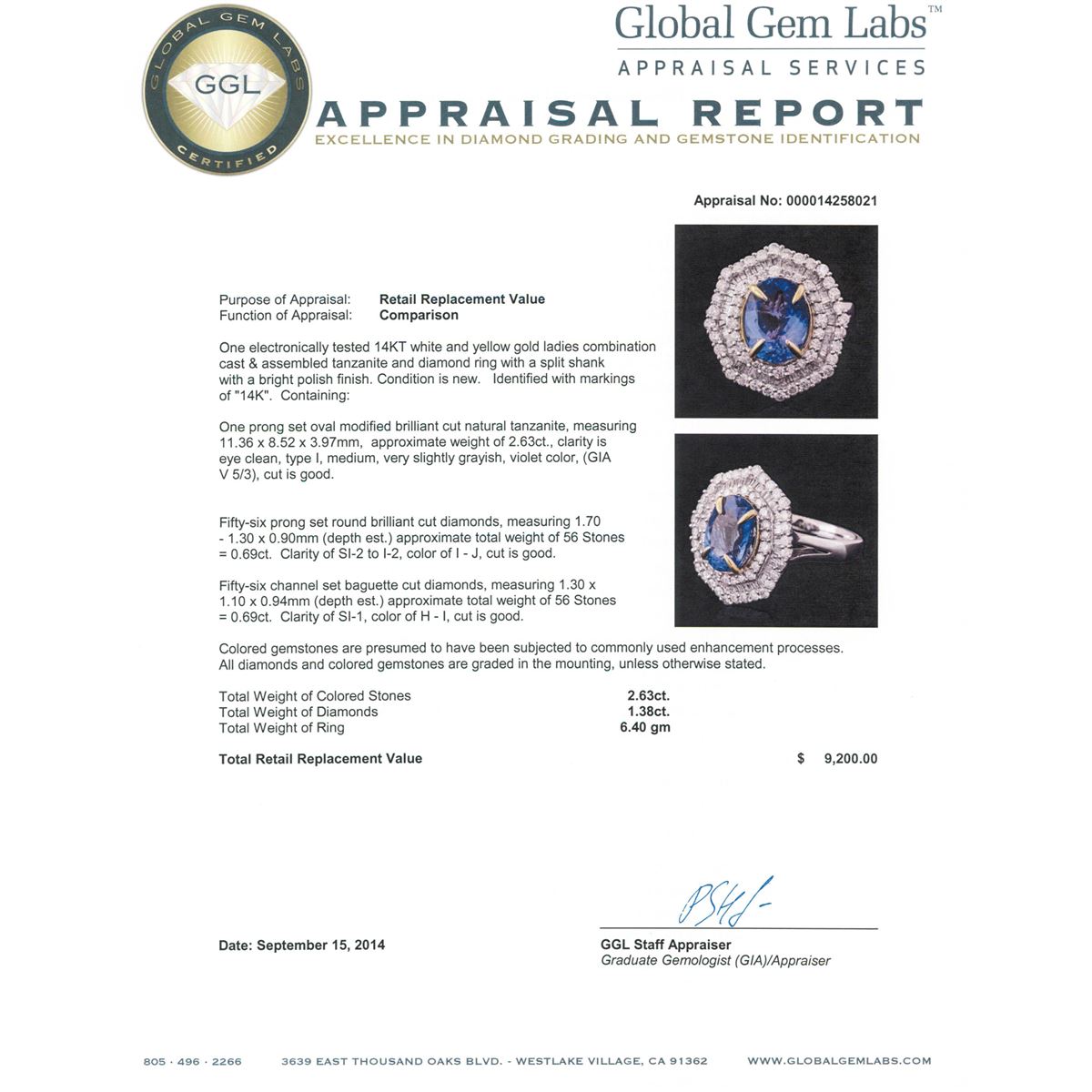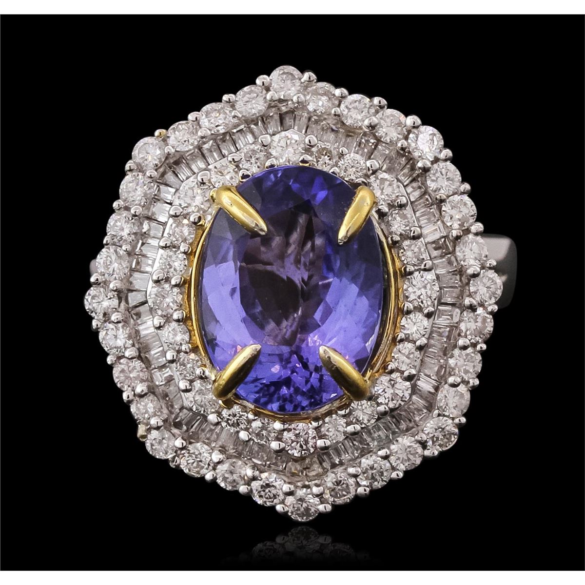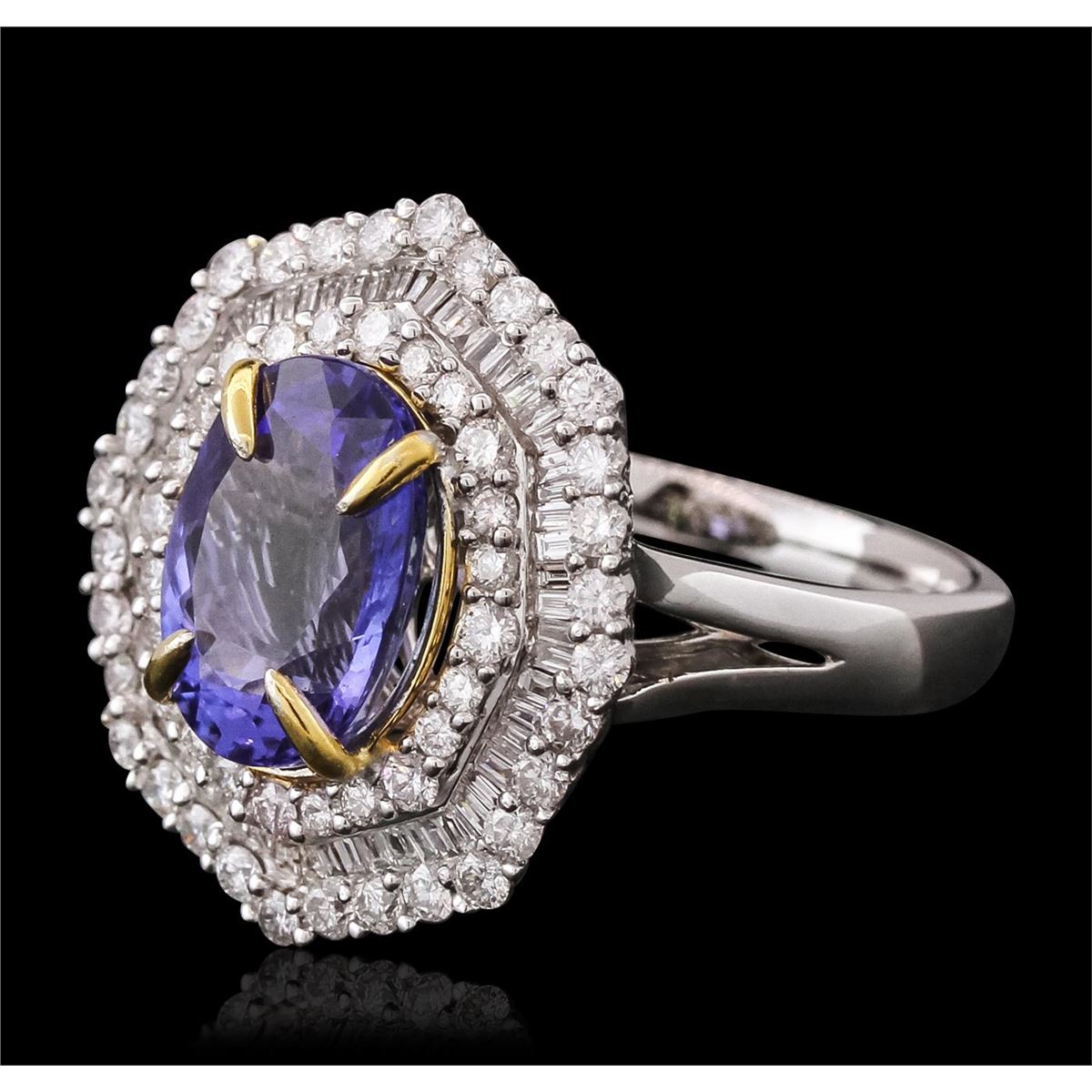 One electronically tested 14KT white and yellow gold ladies combination cast & assembled tanzanite and diamond ring with a split shank with a bright polish finish. Identified with markings of "14K". Condition is new. Containing: One prong set oval modified brilliant cut natural tanzanite, measuring 11.36 x 8.52 x 3.97mm, approximate weight of 2.63ct., clarity is eye clean, type I, medium, very slightly grayish, violet color, (GIA V 5/3), cut is good. Fifty-Six prong set round brilliant cut diamonds, measuring 1.70 - 1.30 x 0.90mm (depth est.) approximate total weight of 56 Stones = 0.69ct. Clarity: SI-2 to I-2. Color: I - J, Cut is Good. Fifty-Six channel set baguette cut diamonds, measuring 1.30 x 1.10 x 0.94mm (depth est.) approximate total weight of 56 Stones = 0.69ct. Clarity: SI-1. Color: H - I, Cut is Good. Colored gemstones are presumed to have been subjected to commonly used enhancement processes. All diamonds and colored gemstones are graded in the mounting, unless otherwise stated total weight of Colored Stones 2.63ct. Total Weight of Diamonds 1.38ct. Total Weight of Ring 6.40 grams. GGL Appraised at $9,200.00.
