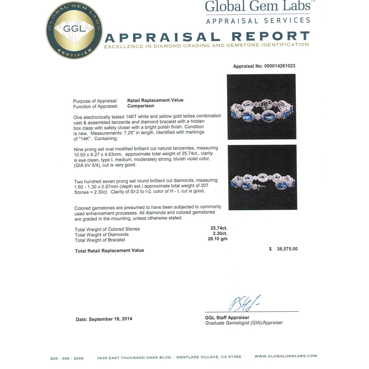 One electronically tested 14KT white and yellow gold ladies combination cast & assembled tanzanite and diamond bracelet with a hidden box clasp with safety closer with a bright polish finish. Measurements: 7.25" in length. Identified with markings of "14K". Condition is new. Containing: Nine prong set oval modified brilliant cut natural tanzanites, measuring 10.93 x 8.27 x 4.63mm, approximate total weight of 25.74ct., clarity is eye clean, type I, medium, moderately strong, bluish violet color, (GIA bV 5/4), cut is very good. Two Hundred Seven prong set round brilliant cut diamonds, measuring 1.60 - 1.30 x 0.87mm (depth est.) approximate total weight of 207 Stones = 2.30ct. Clarity: SI-2 to I-2. Color: H - I, Cut is Good. Colored gemstones are presumed to have been subjected to commonly used enhancement processes. All diamonds and colored gemstones are graded in the mounting, unless otherwise stated. Total Weight of Colored Stones 25.74ct. Total Weight of Diamonds 2.30ct. Total Weight of Bracelet 28.10 grams. GGL Appraised at $38,575.00.