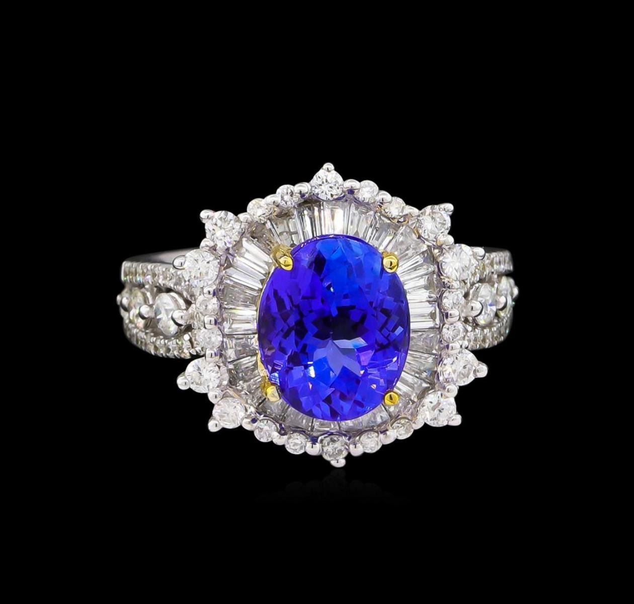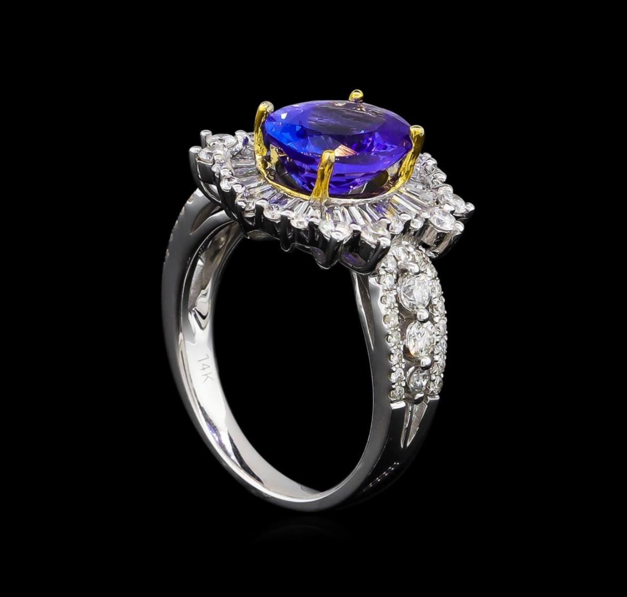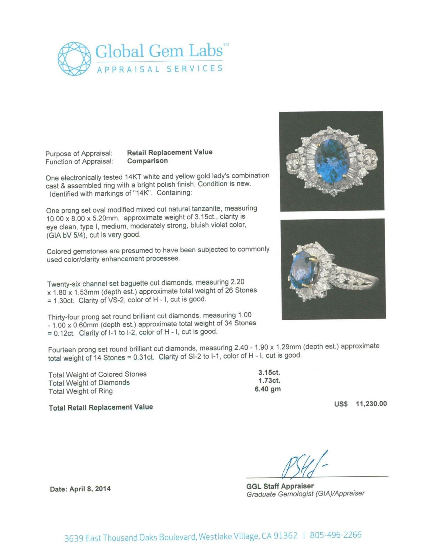 One electronically tested 14KT white and yellow gold Ladies combination cast & assembled ring with a bright polish finish. Condition is new. Identified with markings of "14K". Containing: One prong set oval modified mixed cut natural tanzanite, measuring 10.00 x 8.00 x 5.20mm, approximate weight of 3.15ct., clarity is eye clean, type I, medium, moderately strong, bluish violet color, (GIA bV 5/4), cut is very good. Colored gemstones are presumed to have been subjected to commonly used color/clarity enhancement processes. Twenty-Six channel set baguette cut diamonds, measuring 2.20 x 1.80 x 1.53mm (depth est.) approximate. Total Weight of 26 Stones = 1.30 ct. Clarity: VS-2. Color: H - I, Cut is Good. Thirty-Four prong set round brilliant cut diamonds, measuring 1.00 - 1.00 x 0.60mm (depth est.) approximate. Total Weight of 34 Stones = 0.12ct. Clarity: I-1 to I-2. Color: H - I, Cut is Good. Fourteen prong set round brilliant cut diamonds, measuring 2.40 - 1.90 x 1.29mm (depth est.) approximate. Total Weight of 14 Stones = 0.31ct. Clarity: SI-2 to I-1. Color: H - I, Cut is Good. Total Weight of Colored Stones 3.15ct. Total Weight of Diamonds 1.73ct. Total Weight of Ring 6.40 grams. GGL Appraised.