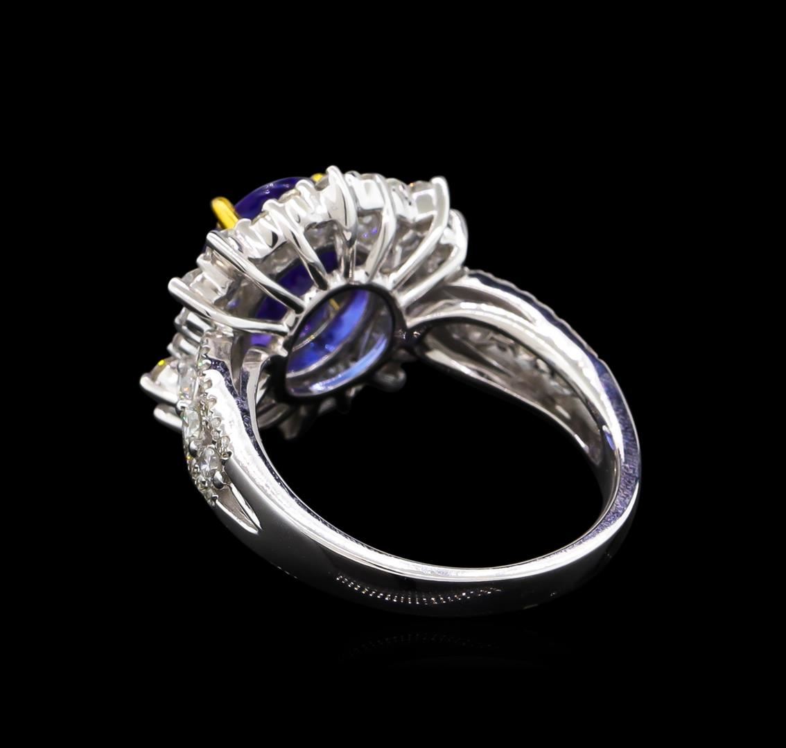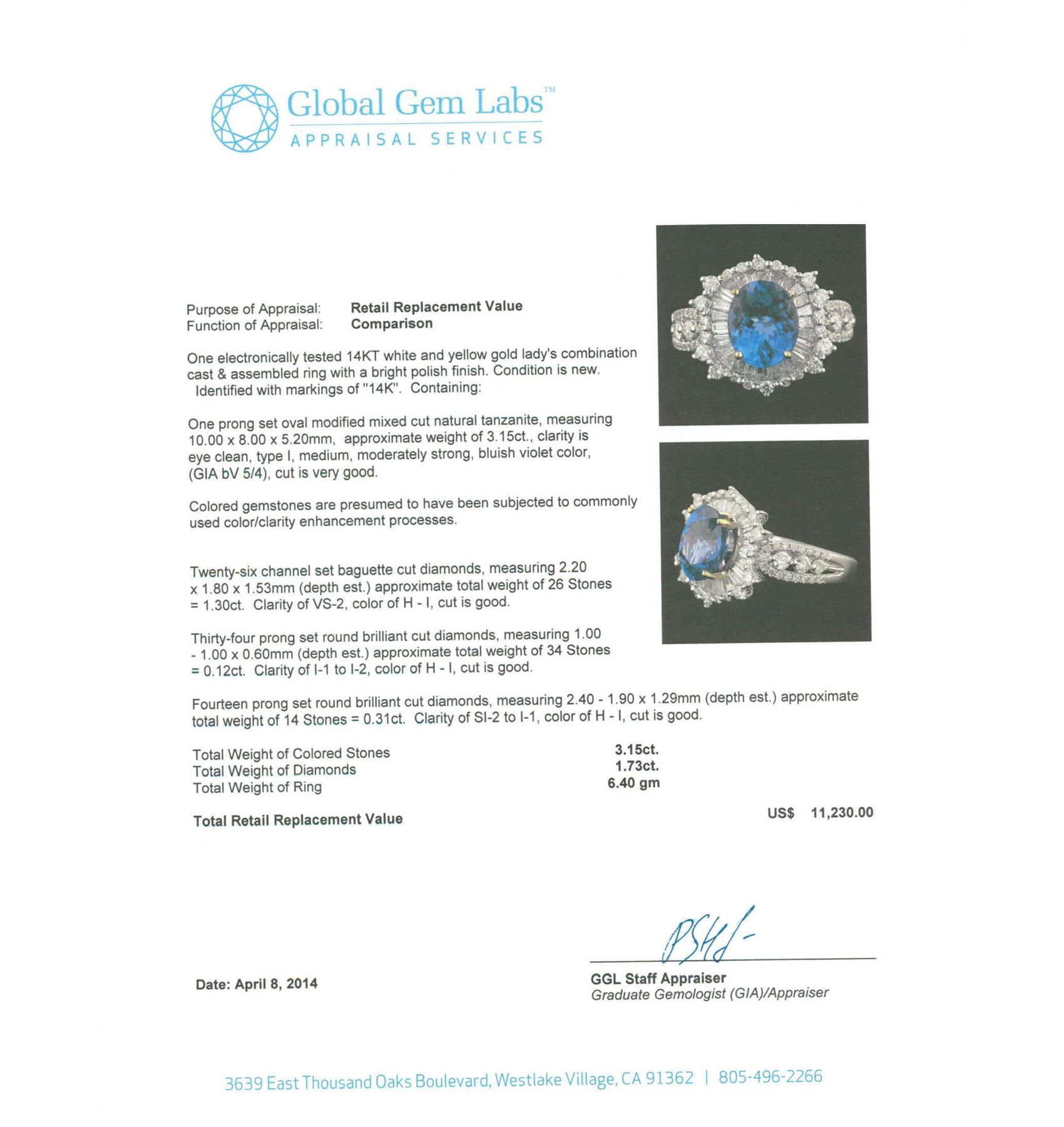 One electronically tested 14KT white and yellow gold Ladies combination cast & assembled ring with a bright polish finish. Condition is new. Identified with markings of "14K". Containing: One prong set oval modified mixed cut natural tanzanite, measuring 10.00 x 8.00 x 5.20mm, approximate weight of 3.15ct., clarity is eye clean, type I, medium, moderately strong, bluish violet color, (GIA bV 5/4), cut is very good. Colored gemstones are presumed to have been subjected to commonly used color/clarity enhancement processes. Twenty-Six channel set baguette cut diamonds, measuring 2.20 x 1.80 x 1.53mm (depth est.) approximate. Total Weight of 26 Stones = 1.30 ct. Clarity: VS-2. Color: H - I, Cut is Good. Thirty-Four prong set round brilliant cut diamonds, measuring 1.00 - 1.00 x 0.60mm (depth est.) approximate. Total Weight of 34 Stones = 0.12ct. Clarity: I-1 to I-2. Color: H - I, Cut is Good. Fourteen prong set round brilliant cut diamonds, measuring 2.40 - 1.90 x 1.29mm (depth est.) approximate. Total Weight of 14 Stones = 0.31ct. Clarity: SI-2 to I-1. Color: H - I, Cut is Good. Total Weight of Colored Stones 3.15ct. Total Weight of Diamonds 1.73ct. Total Weight of Ring 6.40 grams. GGL Appraised.